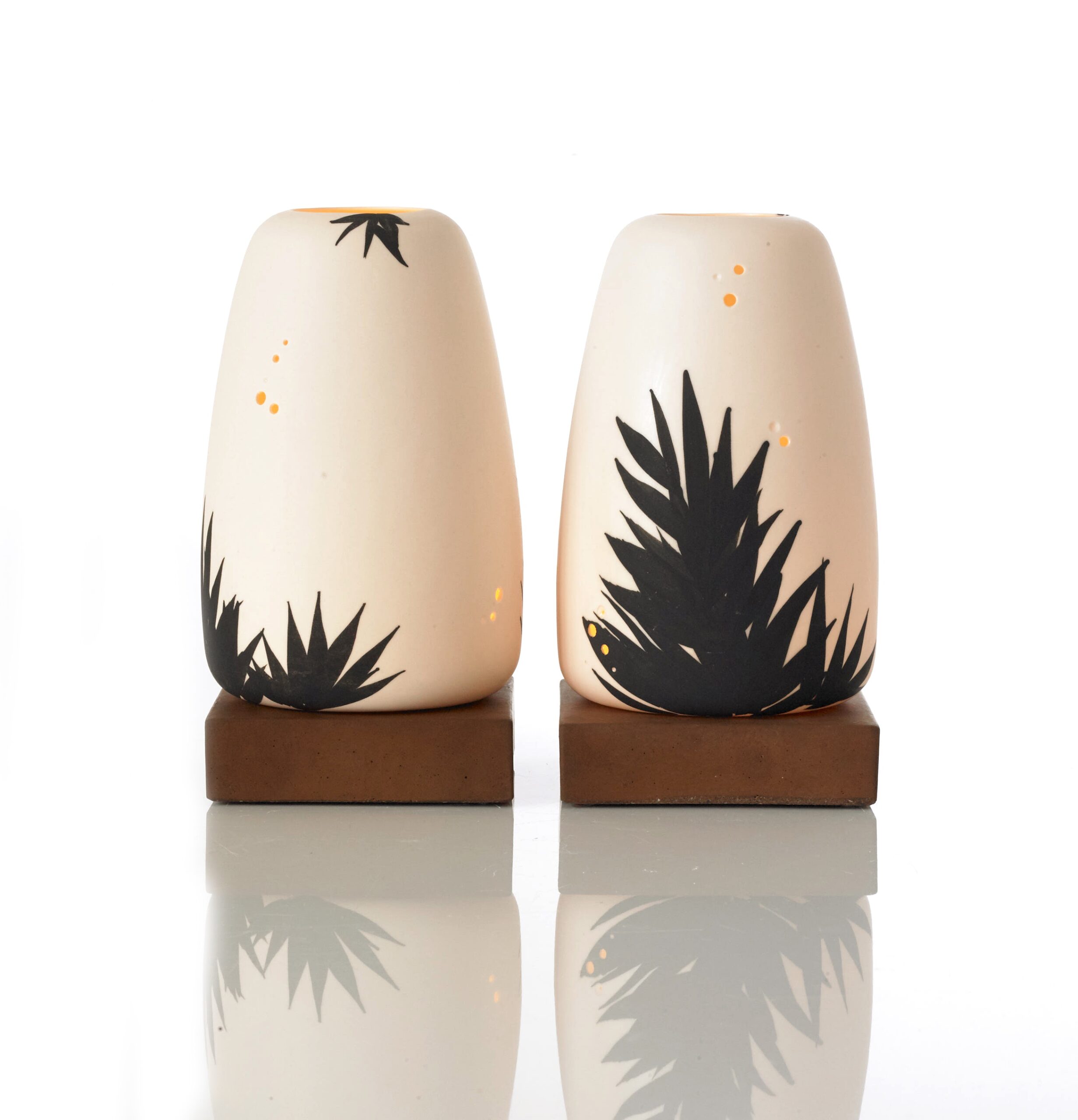 Porcelæns stager er til bordet og er det lille moderne bålsted. Inspirationen er en sammensmeltning af praktiske krav og den maritime restaurant de er skabt til. Stagerne er lavet til store fyrfadslys som er lette at skifte. De er velegnet til at tage med på terrassen da flammen er skærmet godt for vind.