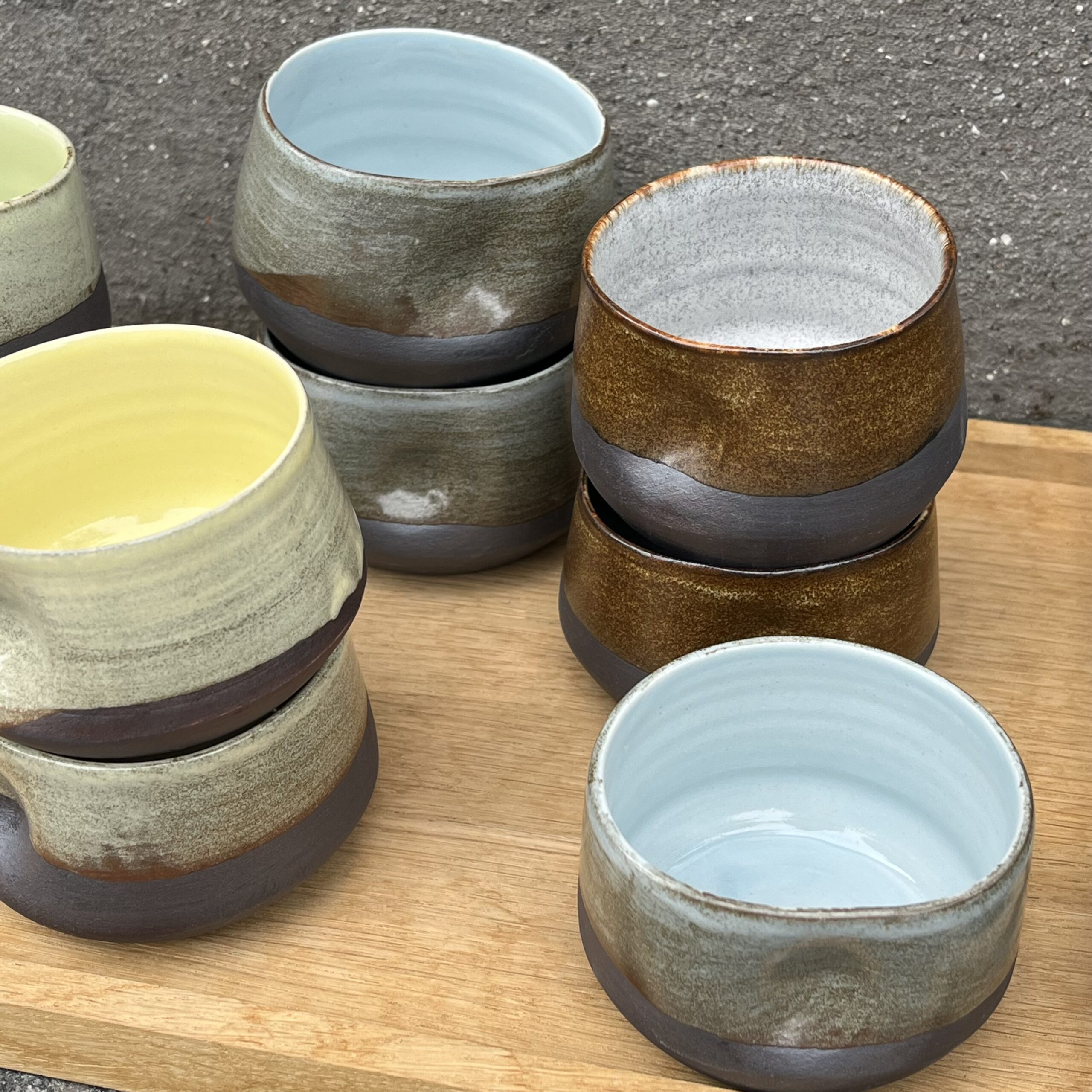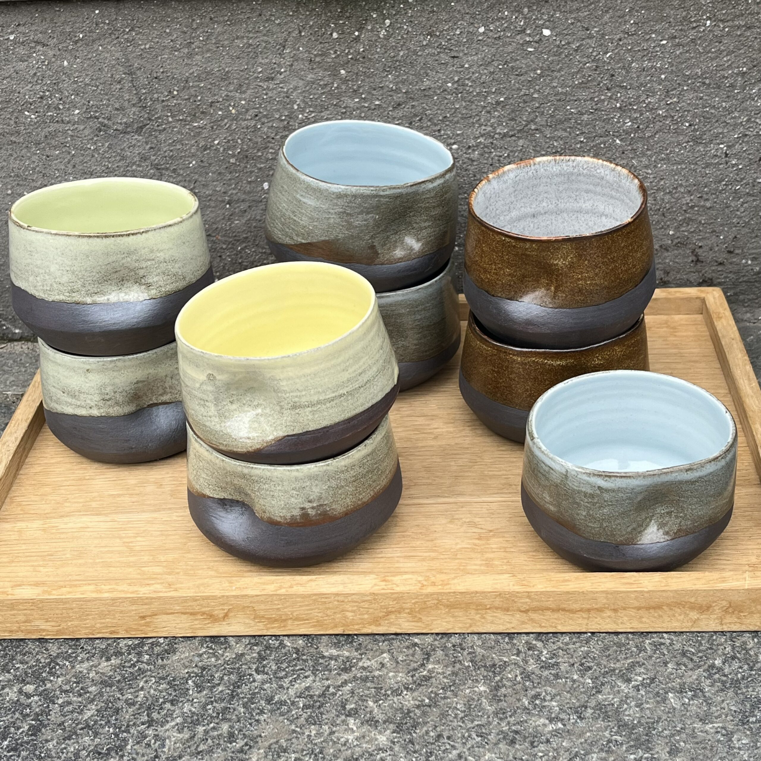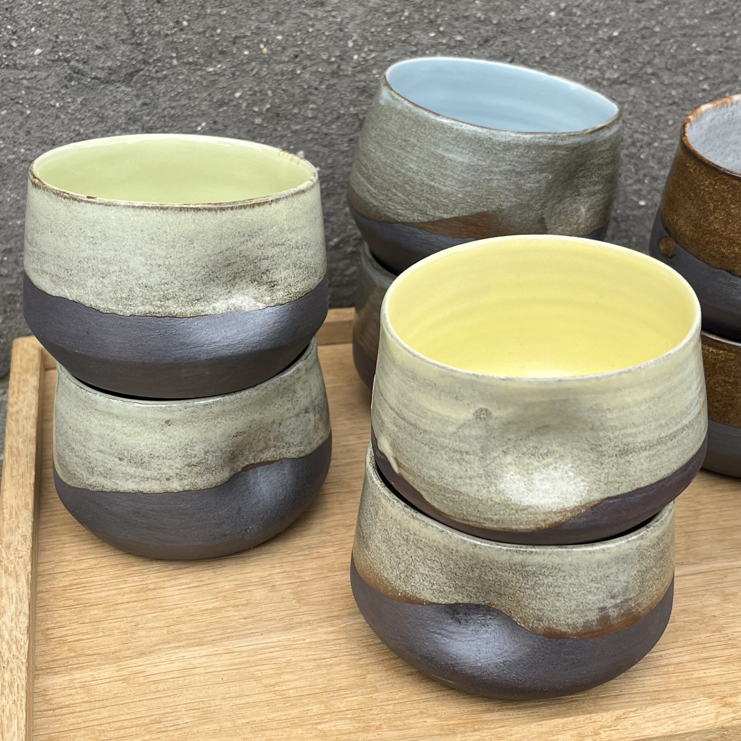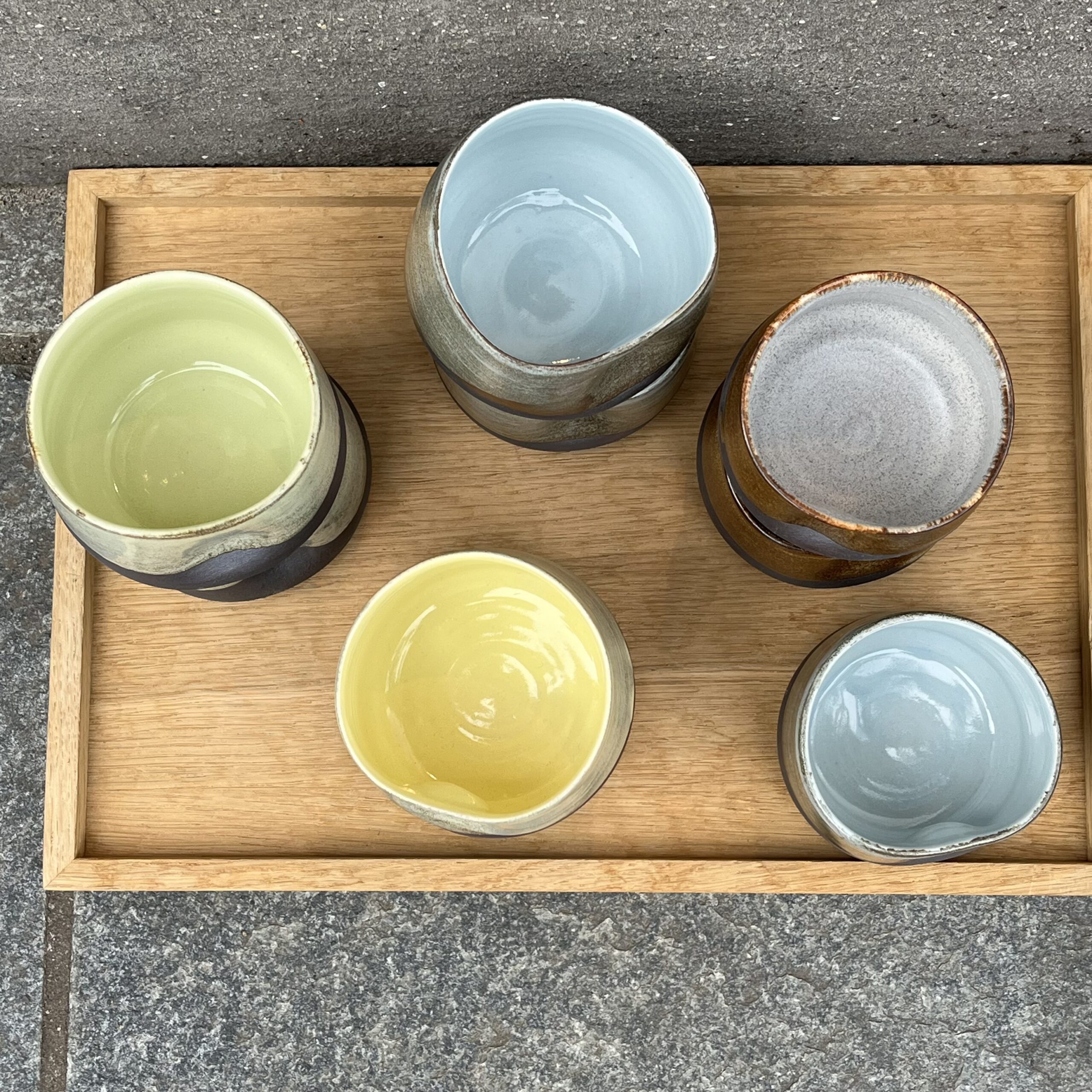 Brunlig farvevariant udenpå kopperne. Farverne inde i kopperne er Citrongul, grøn, blå og grå.