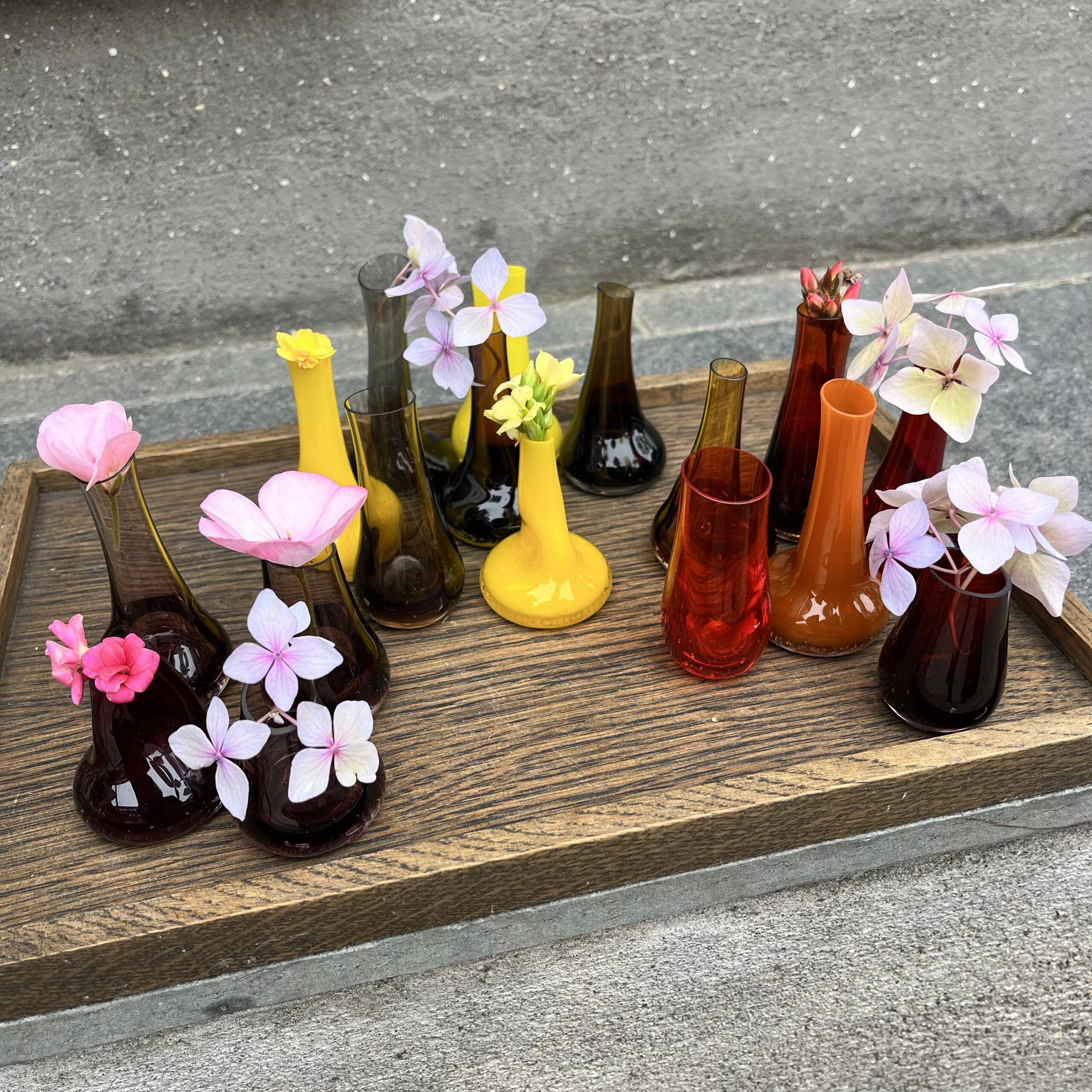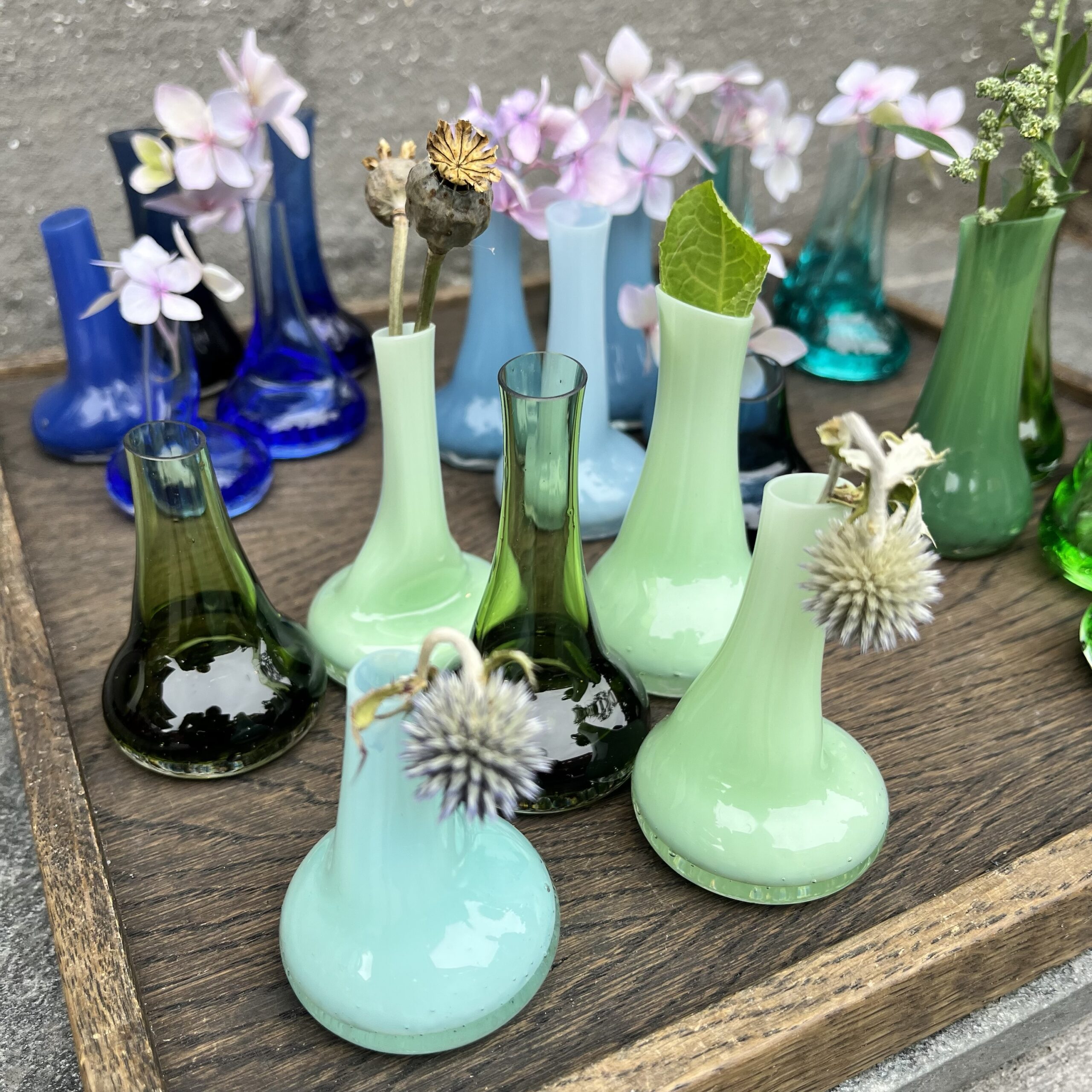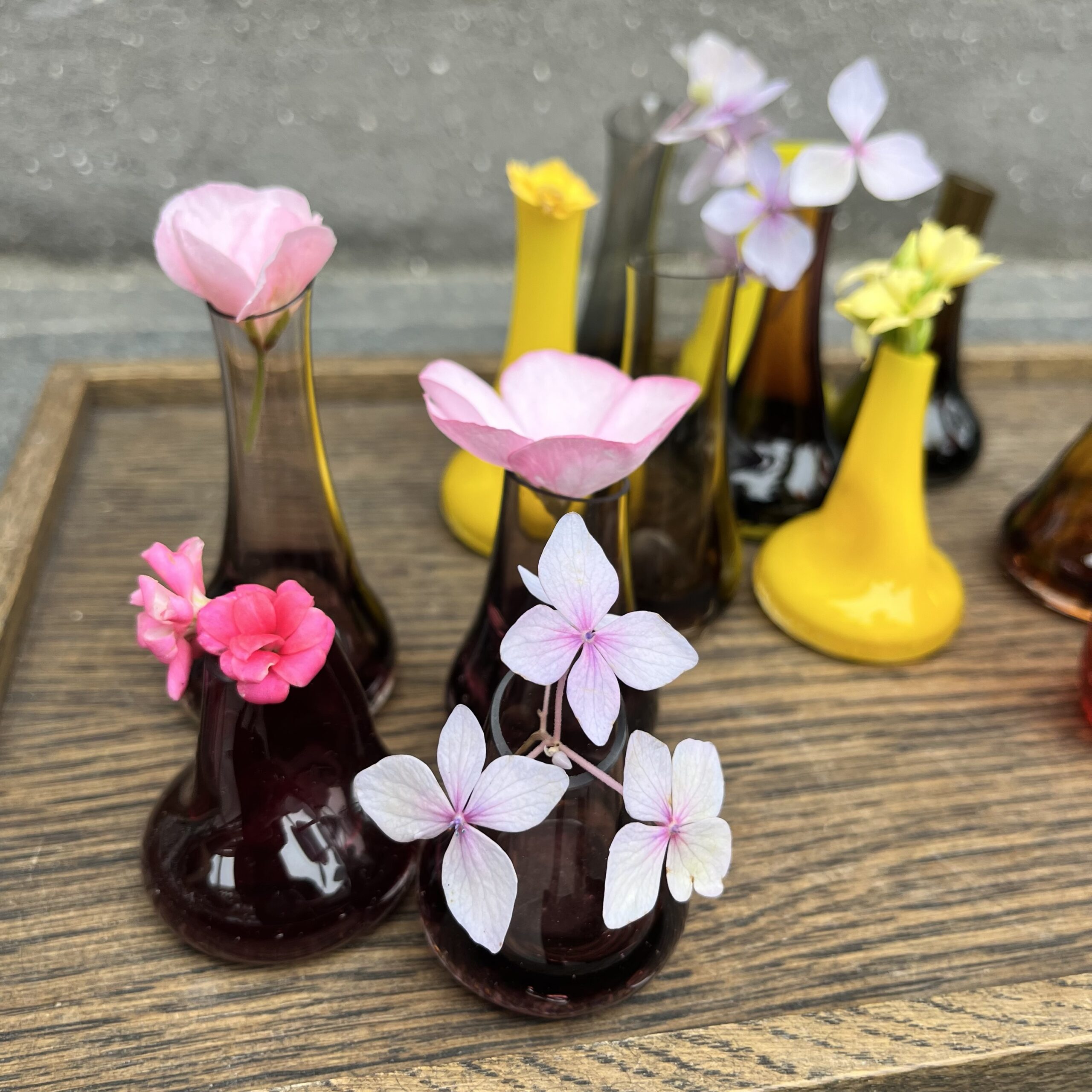 De små glas vaser er gode til borddækning, udsmykning i stuen eller til små blomster fra haven.