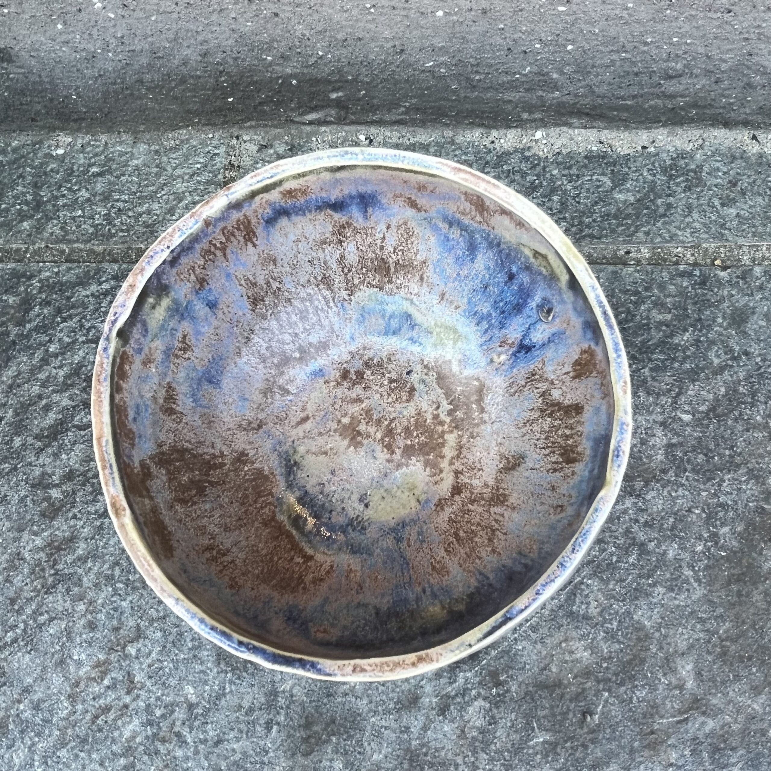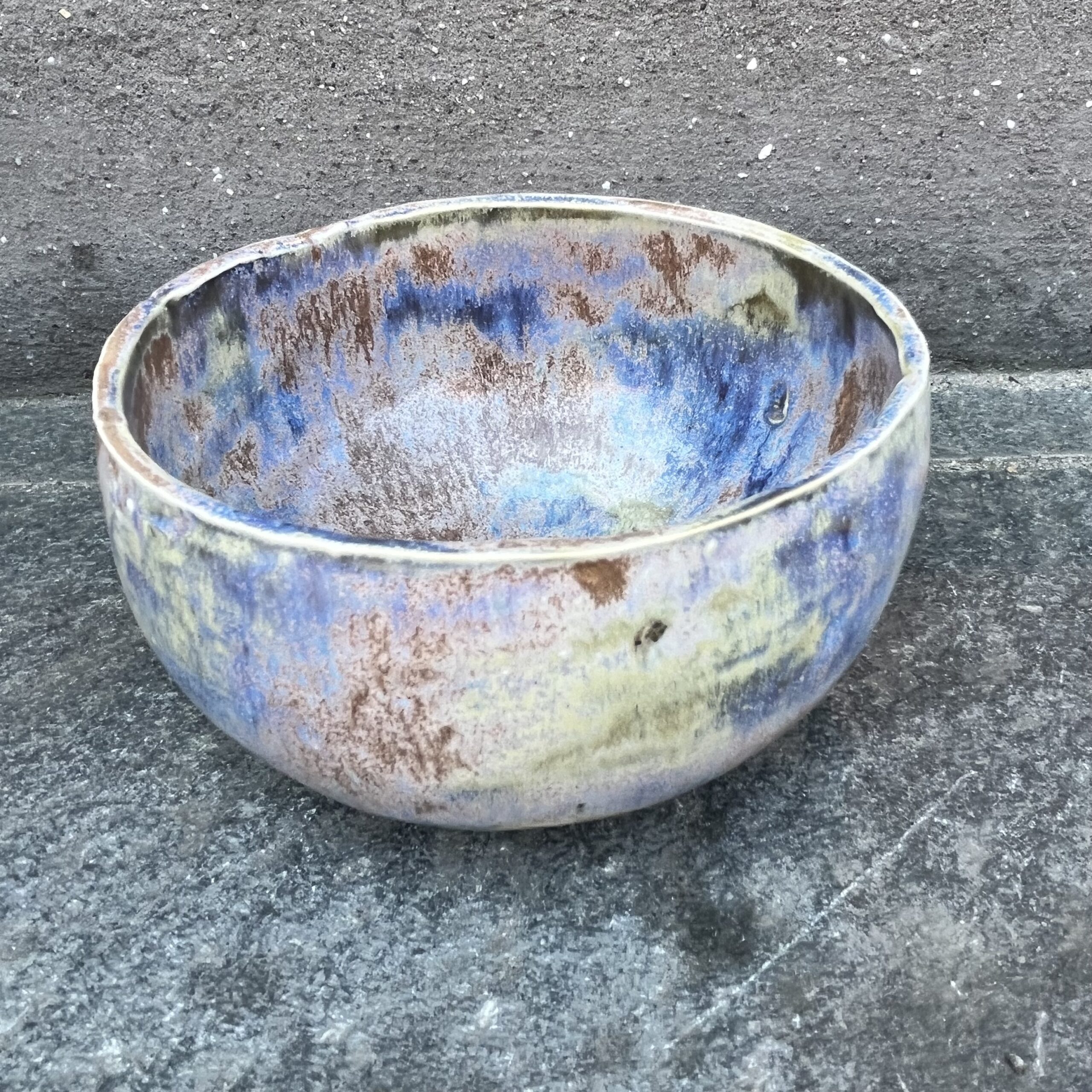 Rustic and colorful round stoneware bowl, with glaze both inside and out.