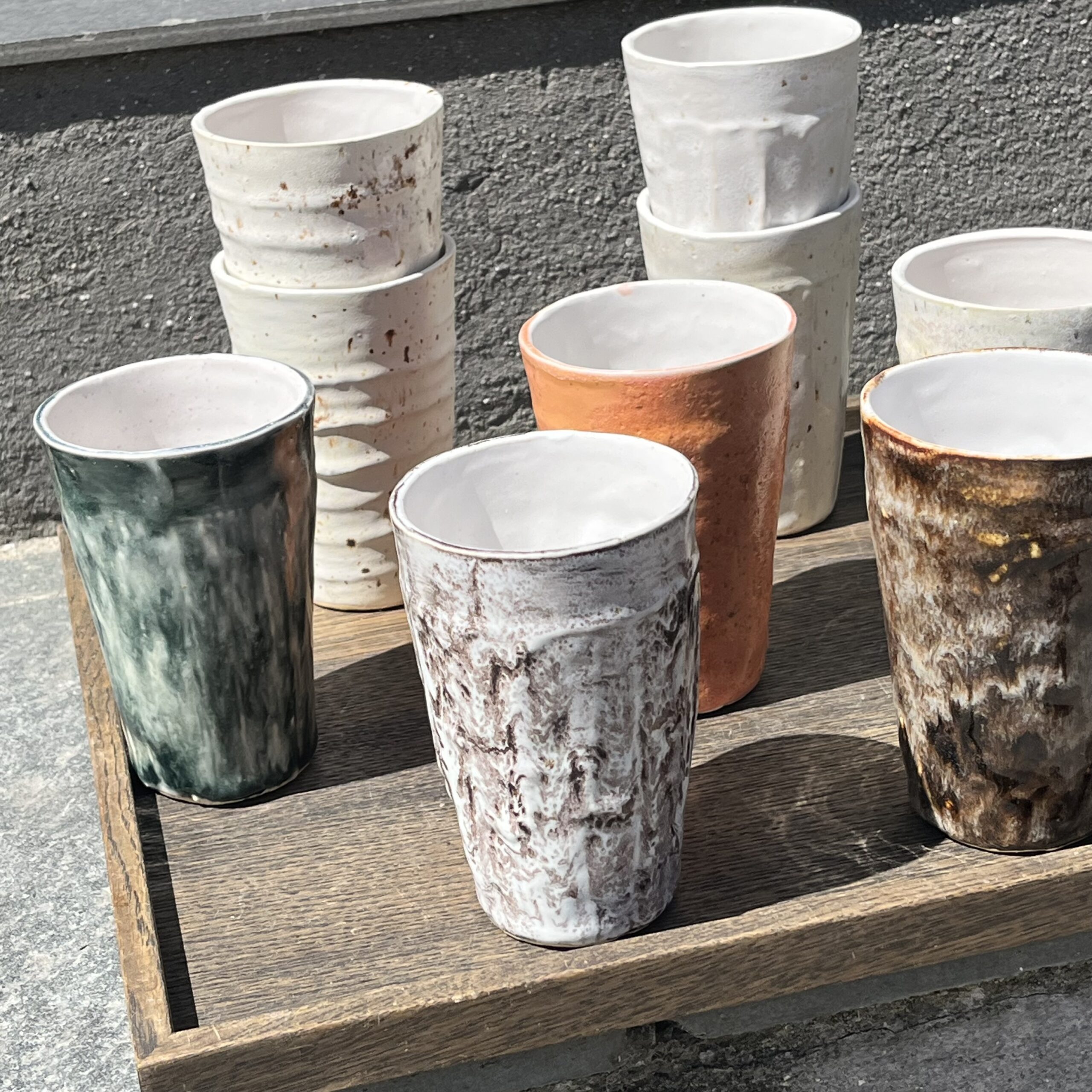 Bjarni Sigurdsson handleless cup with grooves and varied and strong glazes containing volcanic ash from the Eyjafjallajökull eruption.