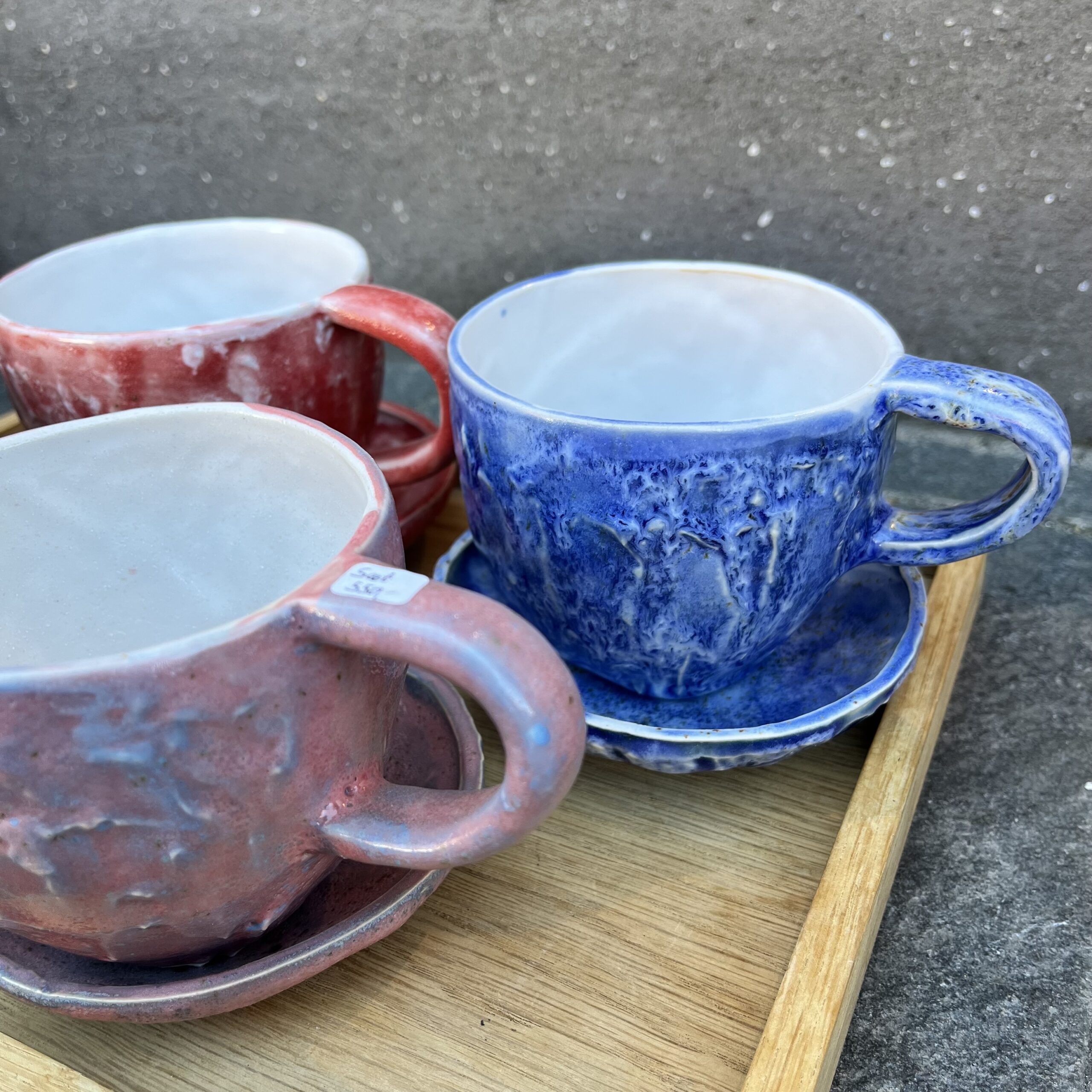 Set of cups and saucers from Bjarni Sigurdsson in varying colors and sizes.