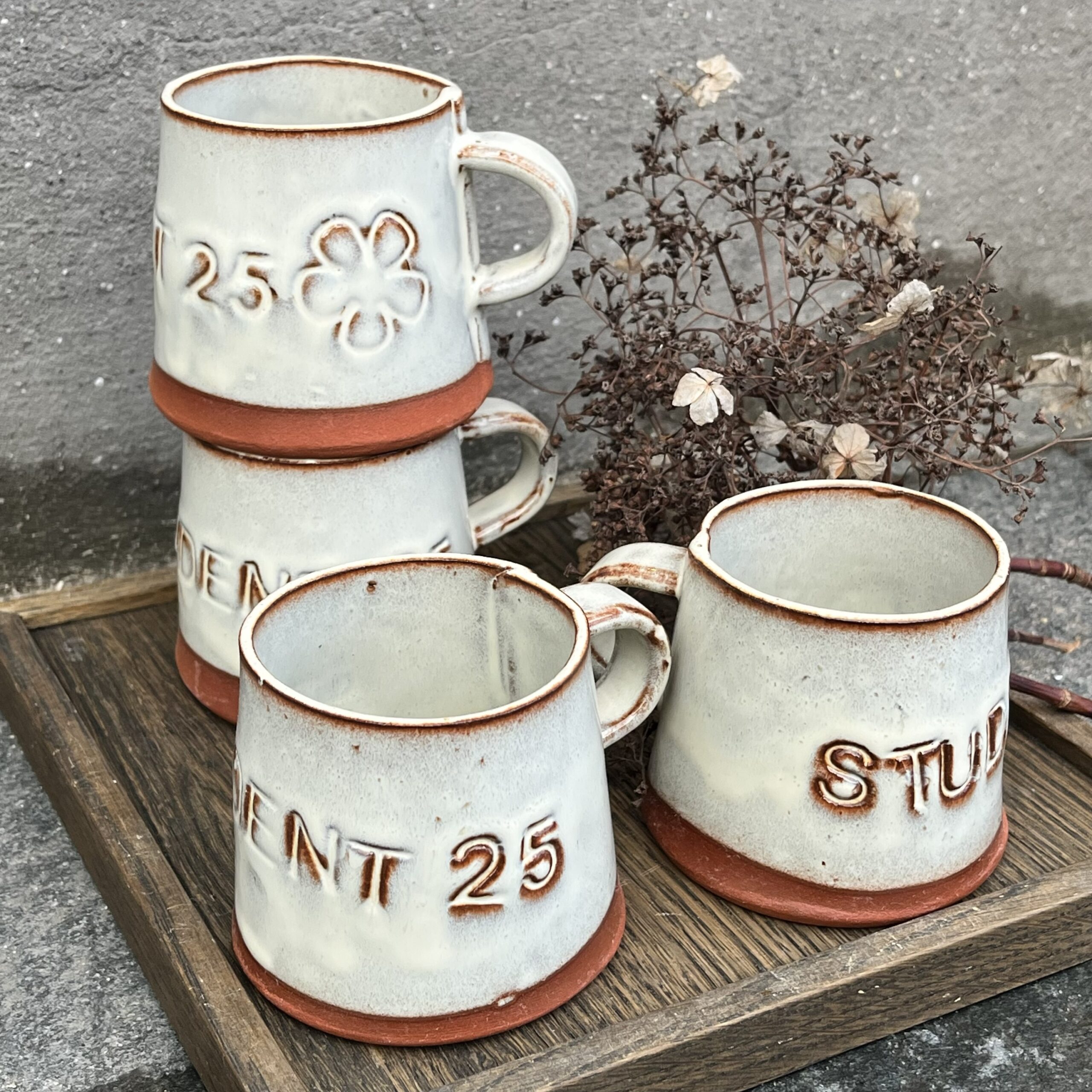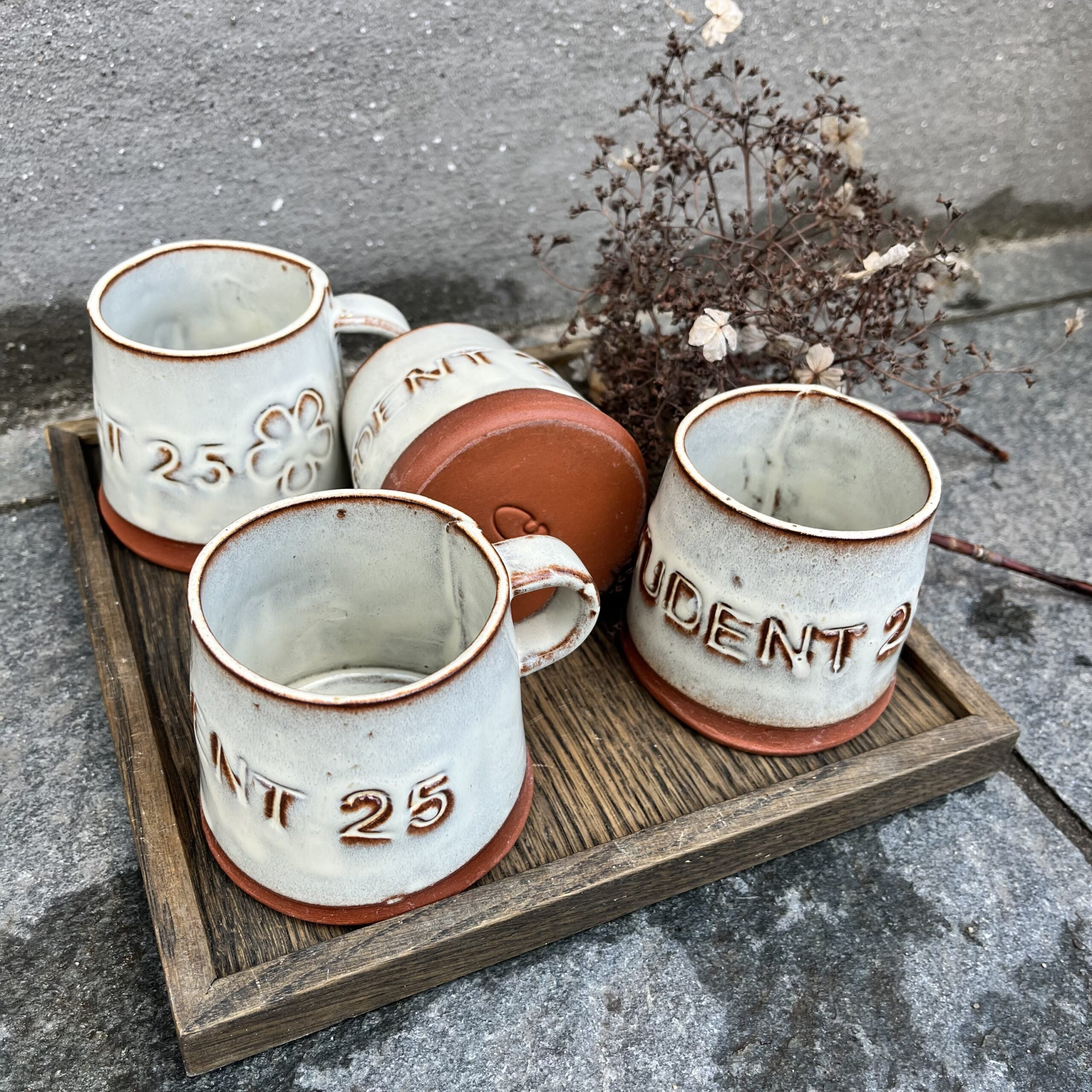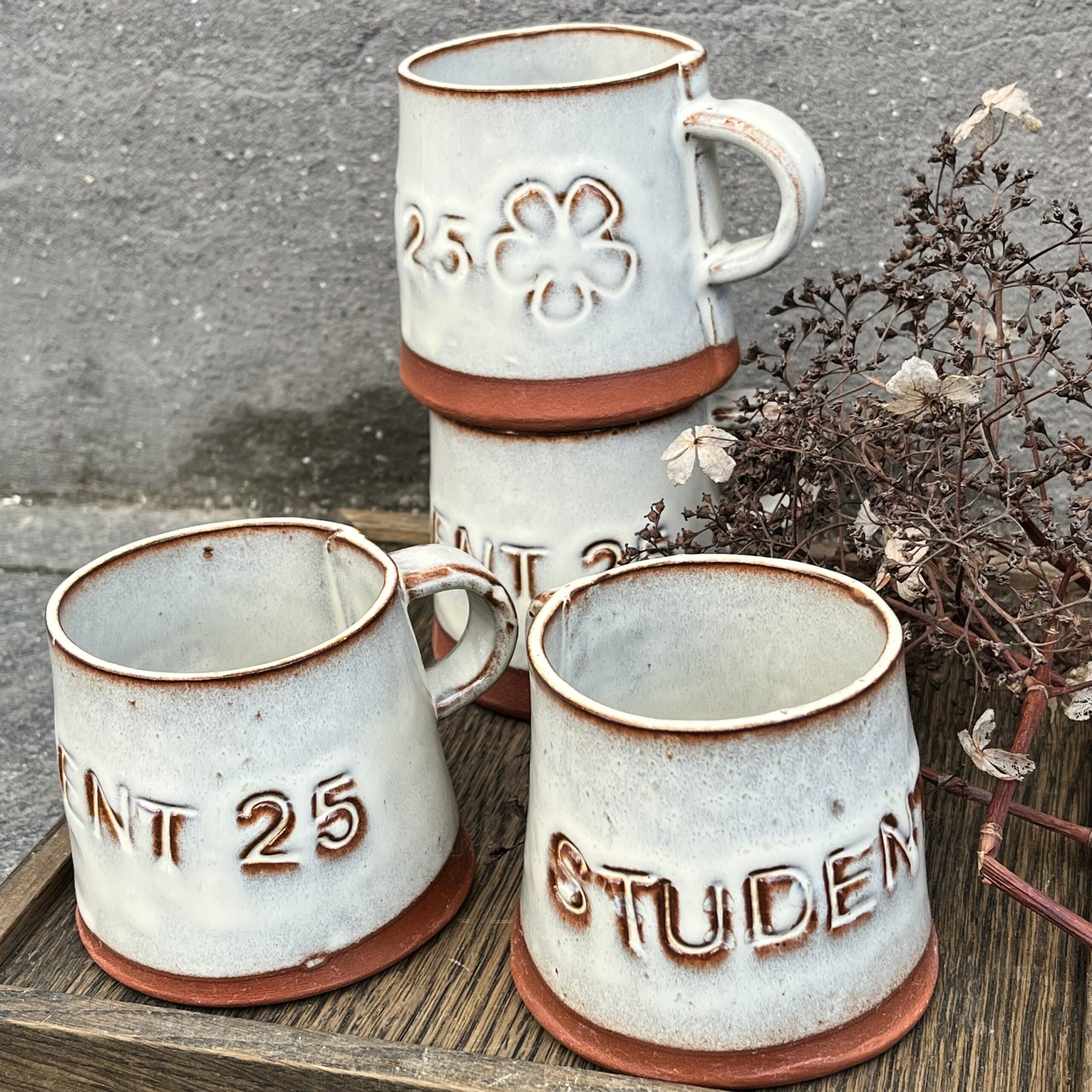 Smukke Student 25 kopper med hank og med lys glasur på lertøj.