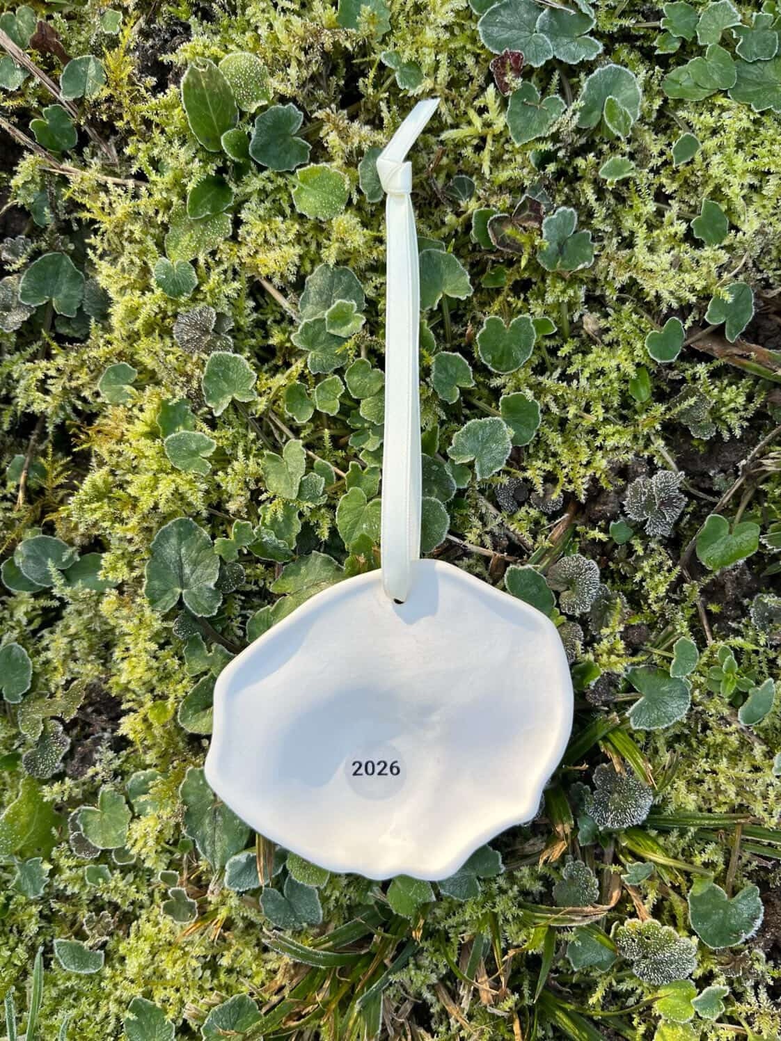 Årstals spejlæg 2026 med trykt årstal bagpå, fra Helle-grej. Med silkesnor til ophæng.