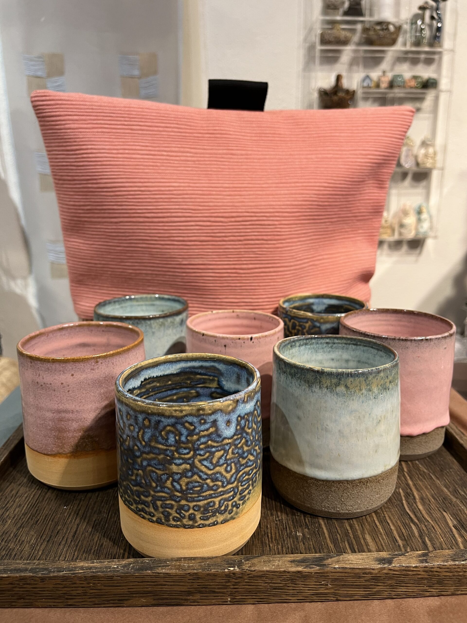 Hånddrejet kaffekrus fra Ler Kunst Slowmade by Lene Kristine i tre forskellige farver, ca. 9 cm højt (diameter ca. 8,5) med lyserød glasur. Kan rumme ca. 3,75 dl.
