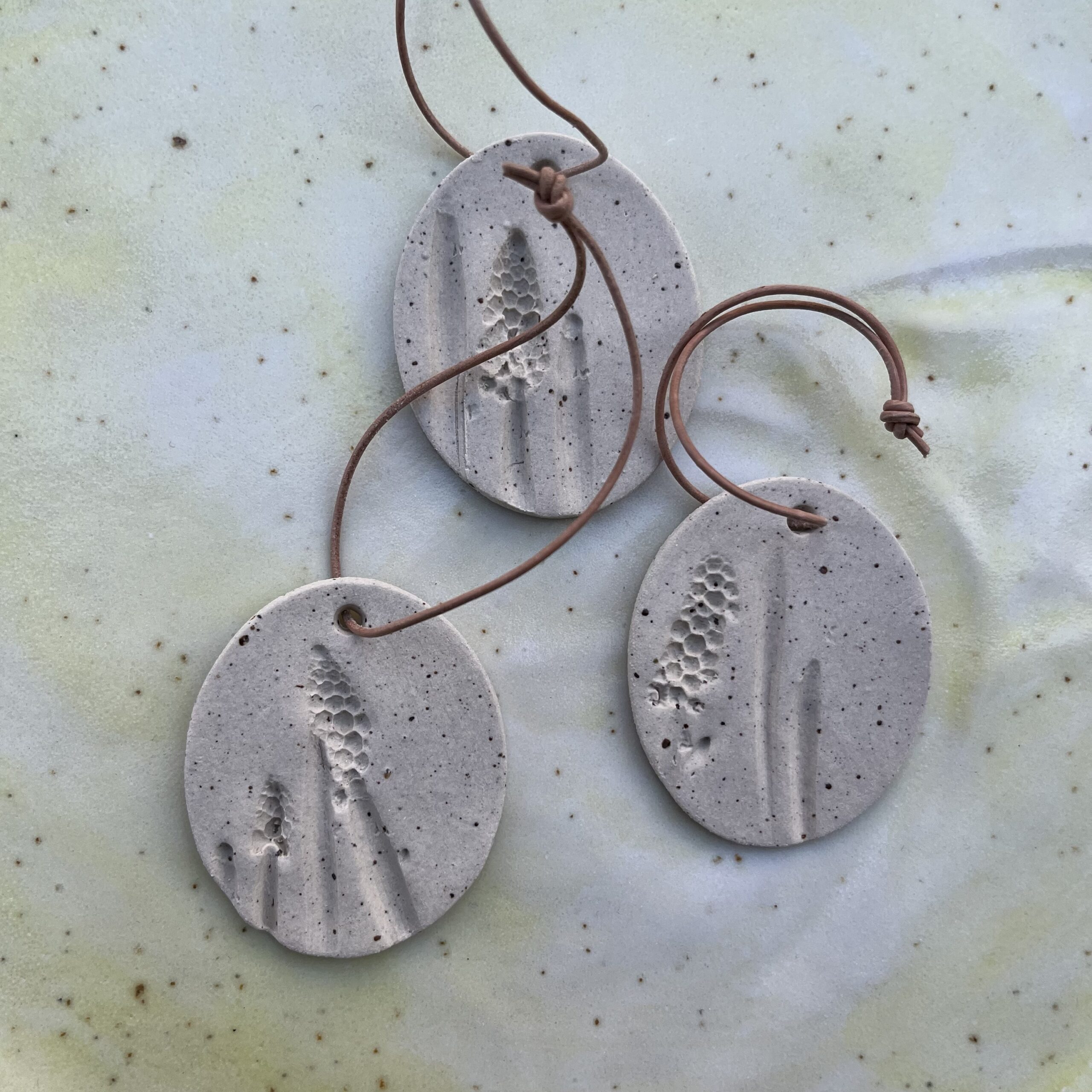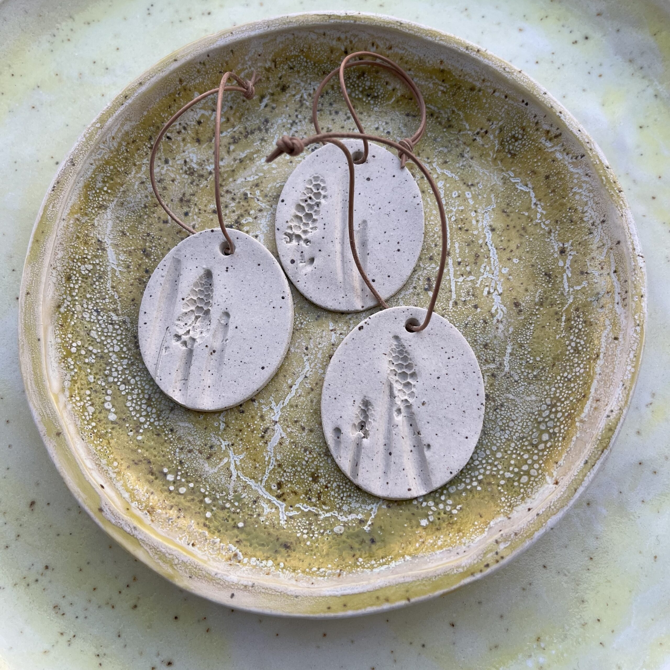 Lavet i tyndt keramik med hul og snor til ophæng på en gren.