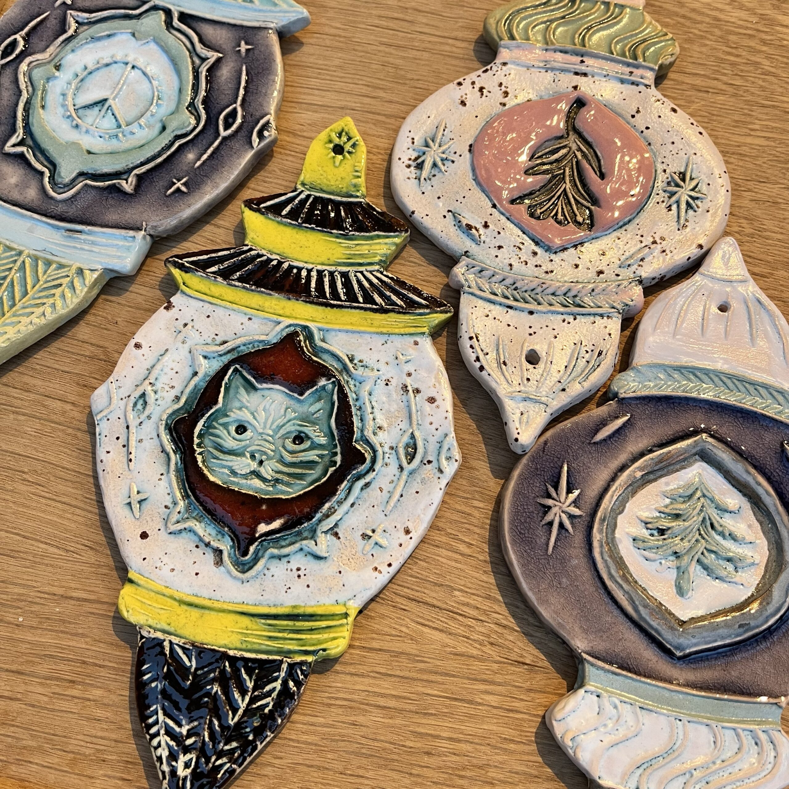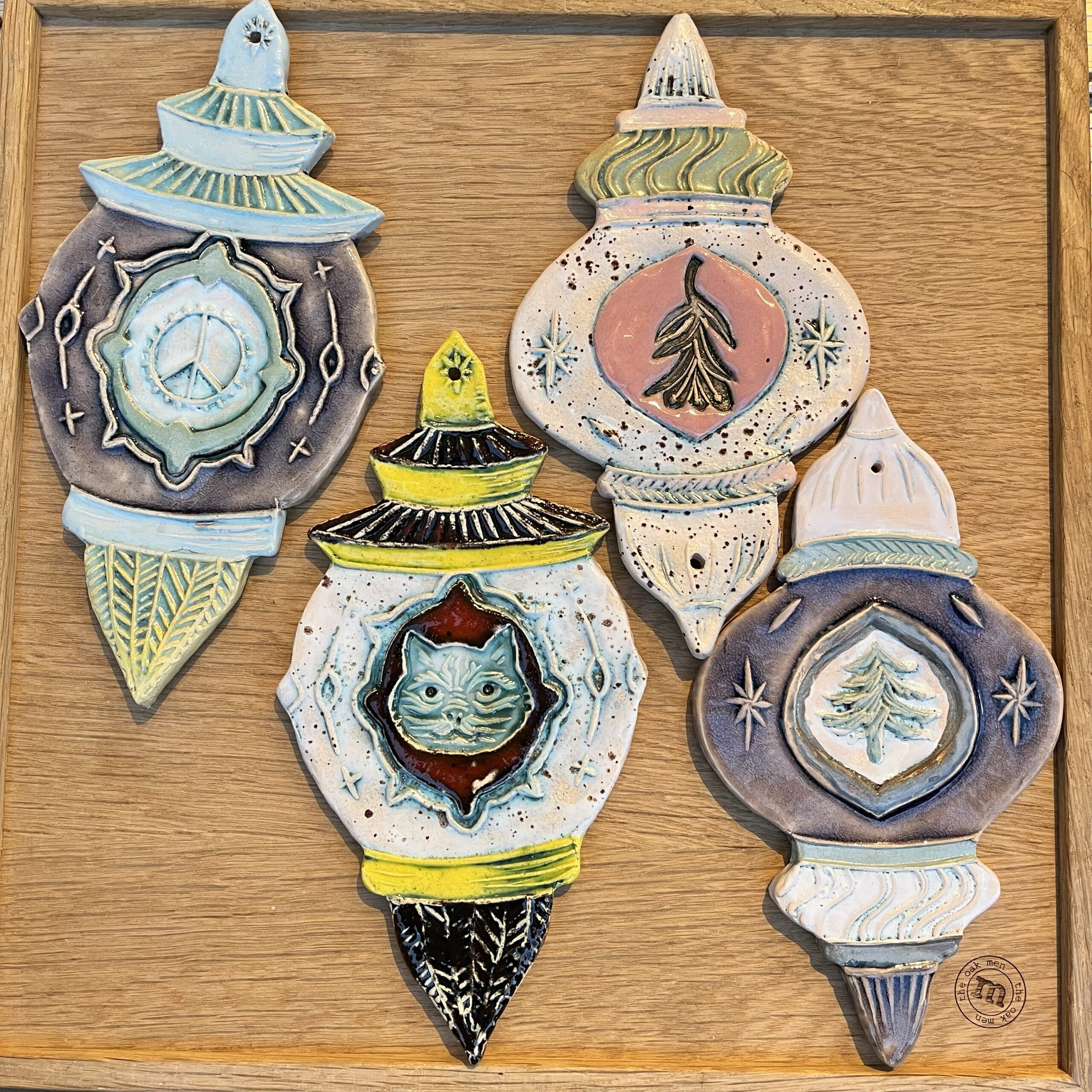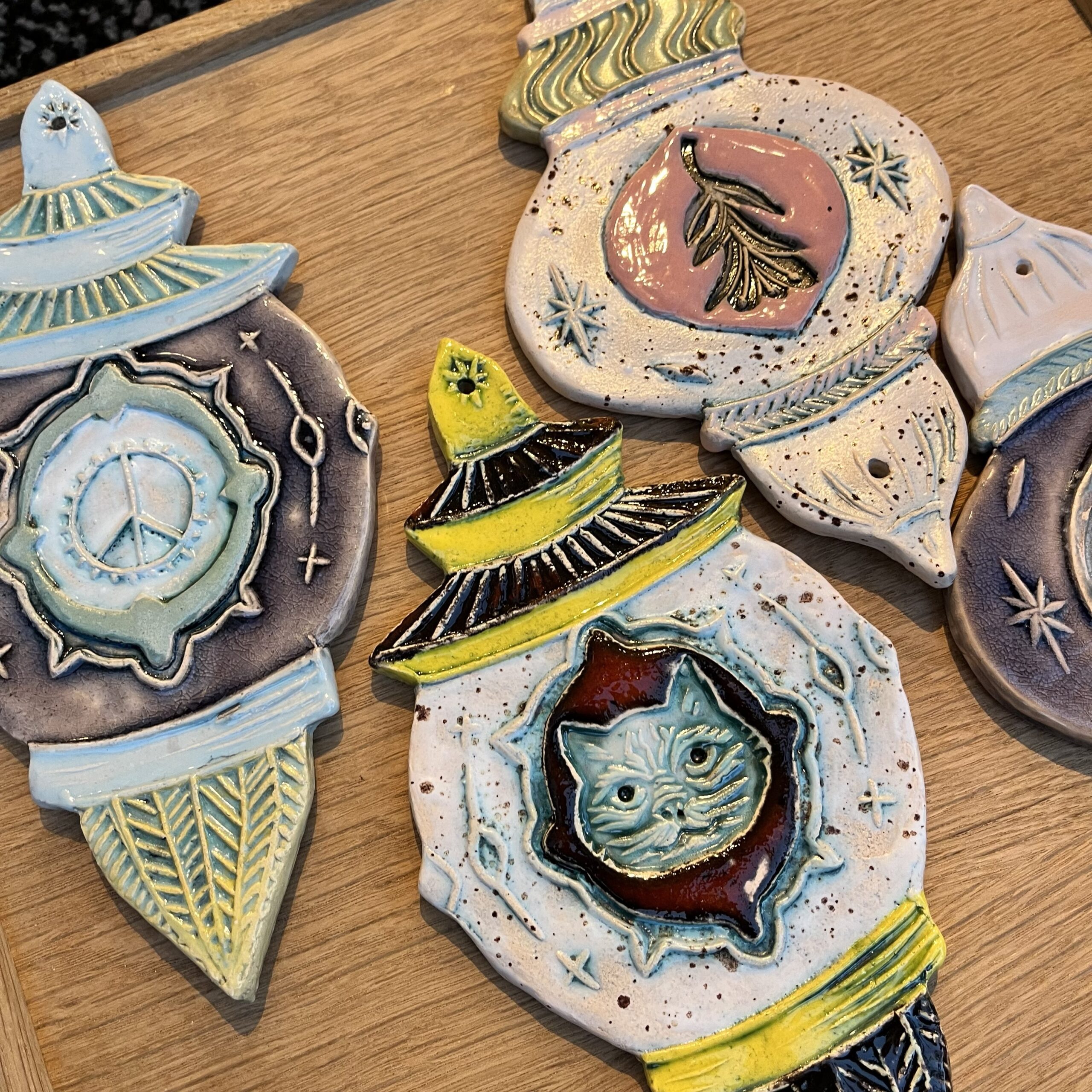 Lige til at hænge på en væg eller lignende. Vægornament er i lertøj, glaseret på begge sider.