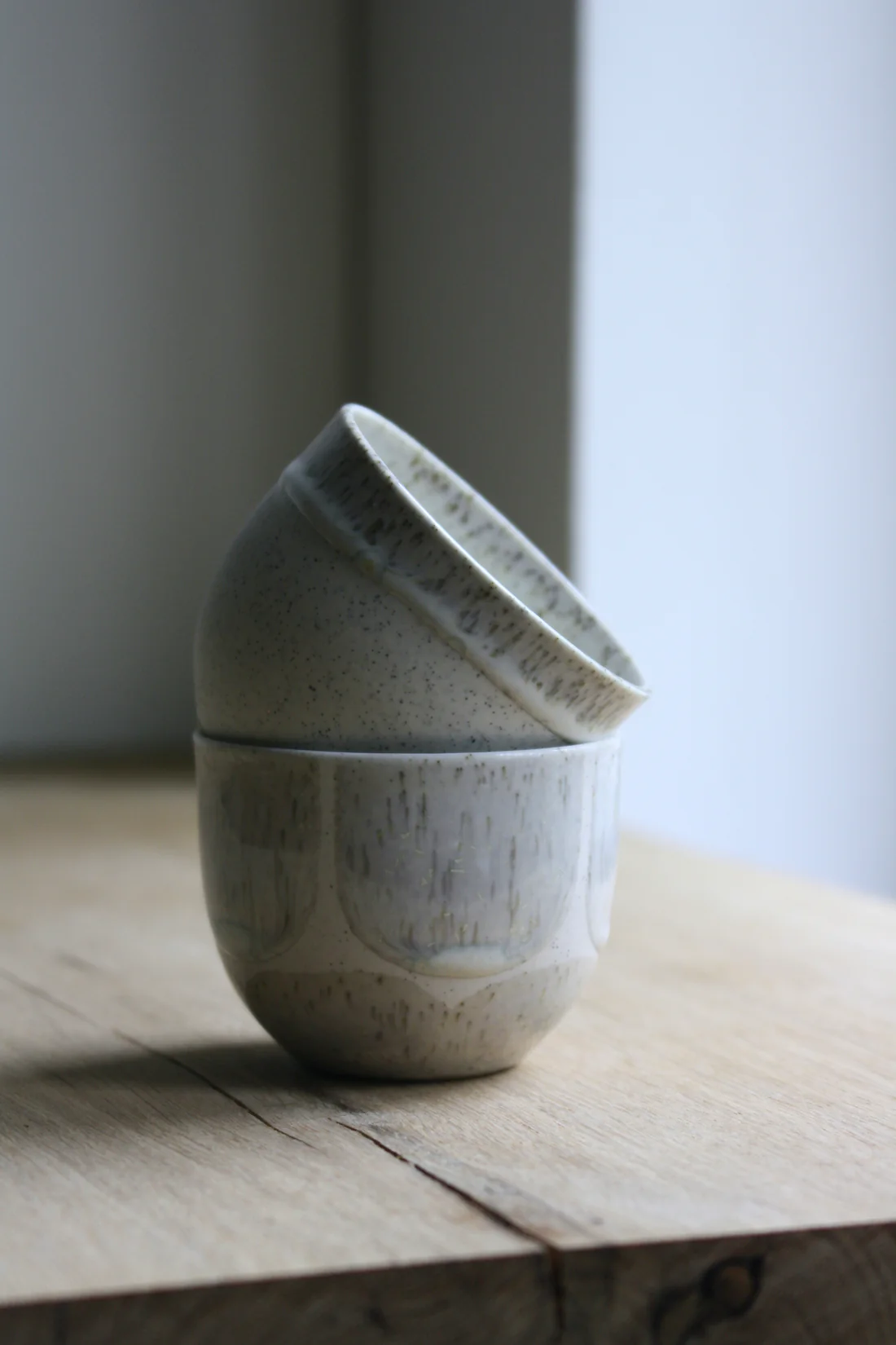 Cortado-koppen er støbt i lys stentøj indfarvet med grå jernspåner. Efter den første brænding er koppen glaseret på indersiden og derefter håndmalet med krystalglasur på ydersiden. Glasurdekorationen fremhæver jernprikkerne og samtidig skabes der en fin kontrast mellem det matte porcelæn og den blanke glasur.