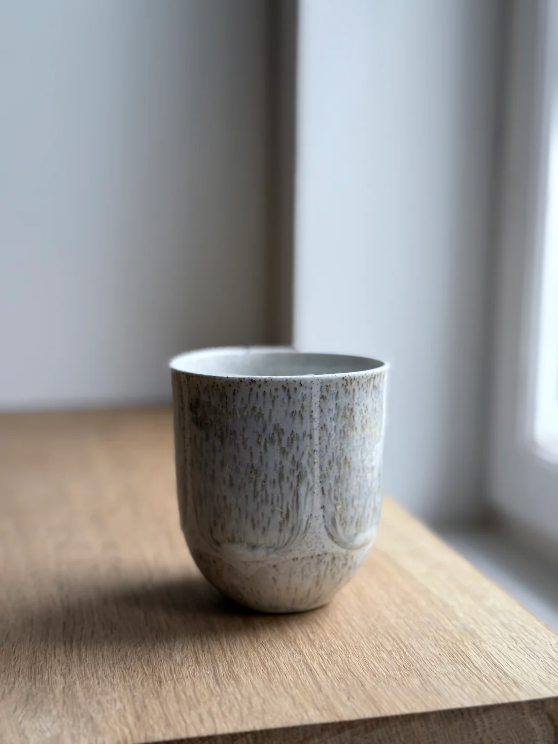 Koppen er lavet i lys stentøj indfarvet med grå jernspåner. Efter den første brænding er koppen glaseret på indersiden og derefter håndmalet med krystalglasur på ydersiden. Glasurdekorationen fremhæver jernprikkerne og samtidig skabes der en fin kontrast mellem det matte porcelæn og den blanke glasur.