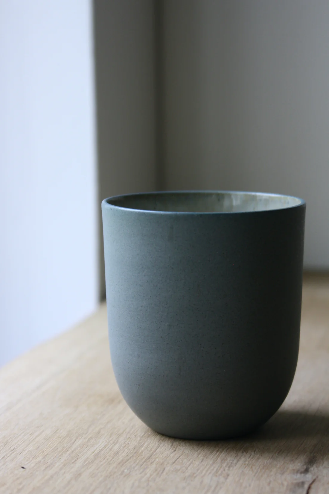 Koppen er lavet i indfarvet blågrå stentøj med grå jern-prikker. Efter den første brænding er koppen glaseret på indersiden med krystalglasur og efterfølgende vandslebet på ydersiden så koppen er blød og rar at røre ved.