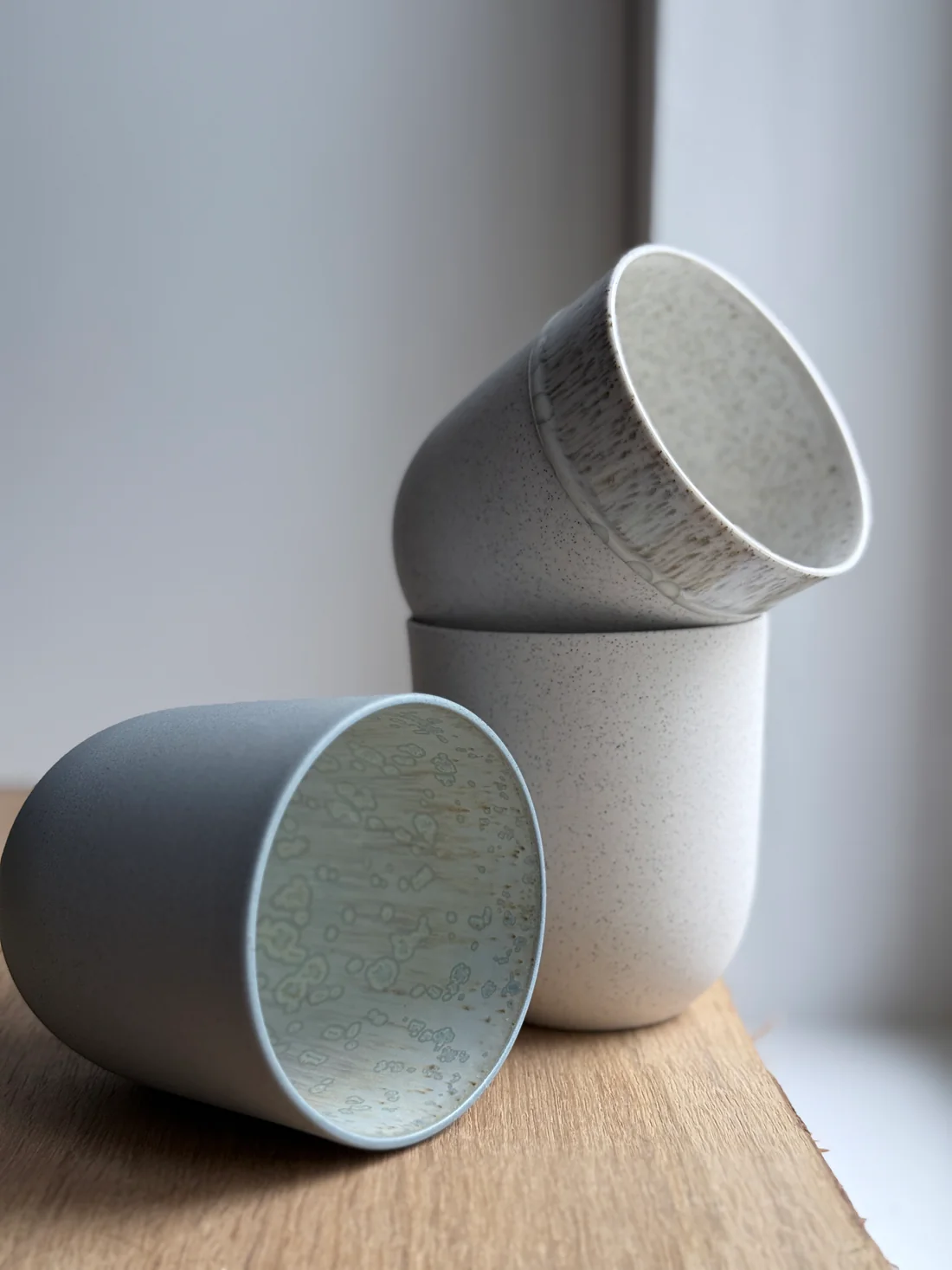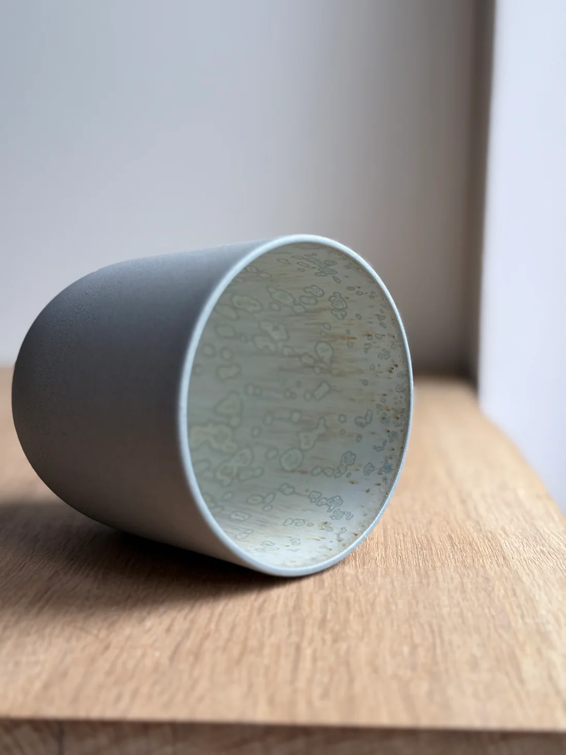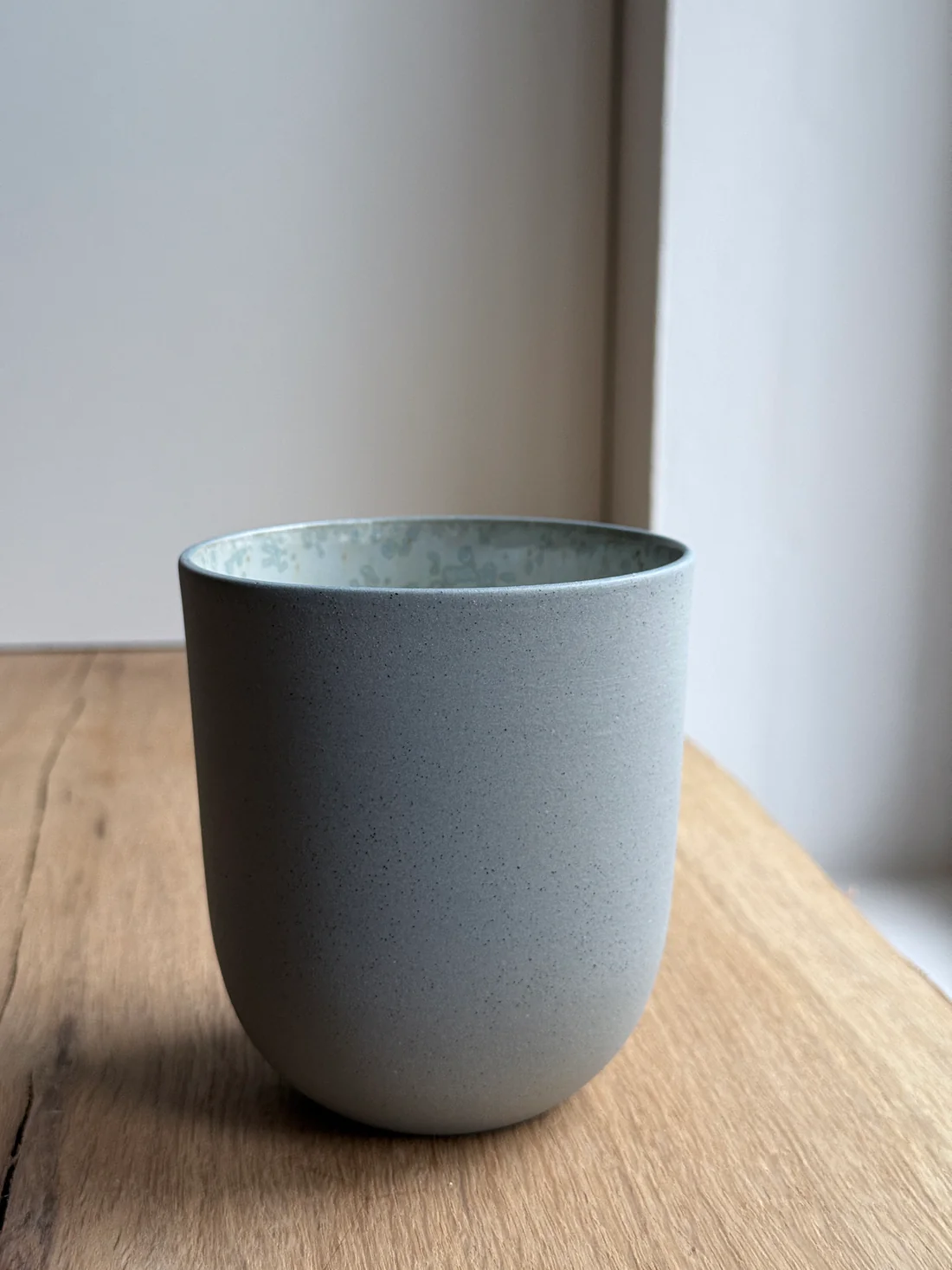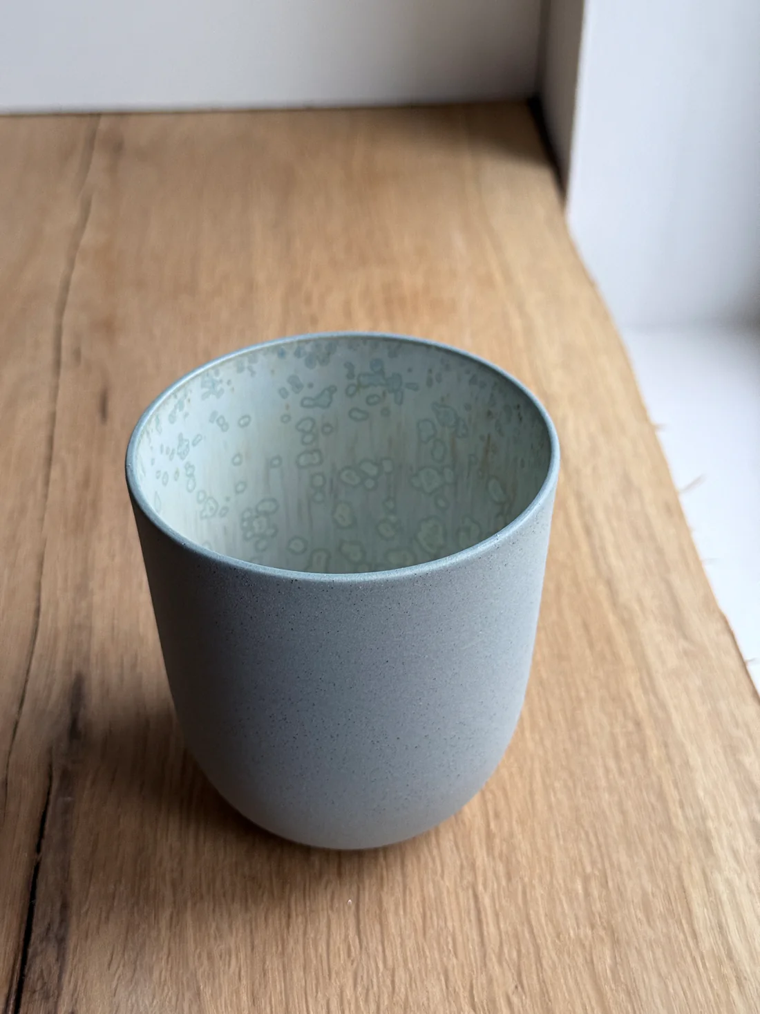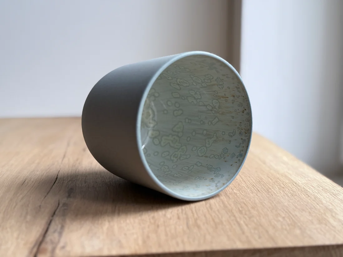 Koppen er lavet i indfarvet blågrå stentøj med grå jern-prikker. Efter den første brænding er koppen glaseret på indersiden med krystalglasur og efterfølgende vandslebet på ydersiden så koppen er blød og rar at røre ved.