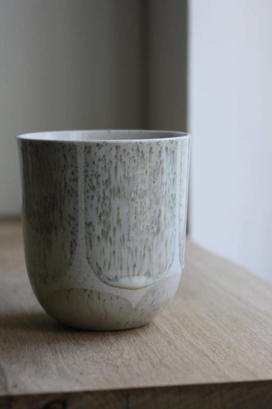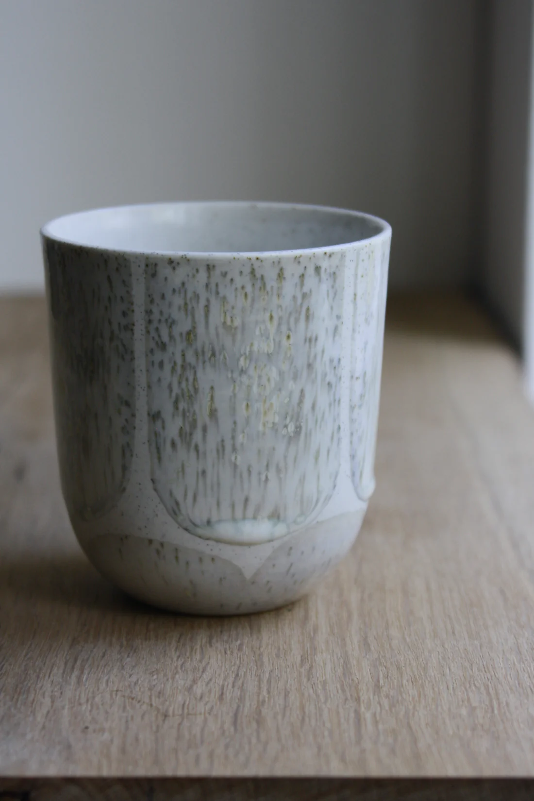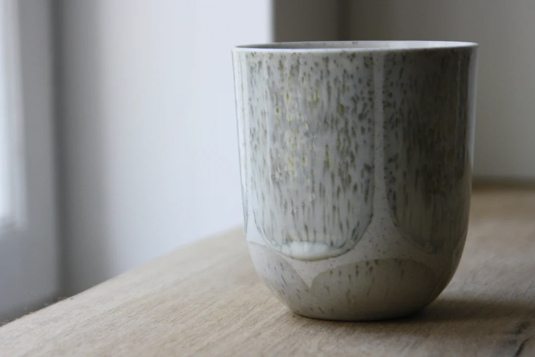 Koppen er støbt i lys stentøj indfarvet med grå jernspåner. Efter den første brænding er koppen glaseret på indersiden og derefter håndmalet med krystalglasur på ydersiden. Glasurdekorationen fremhæver jernprikkerne og samtidig skabes der en fin kontrast mellem det matte porcelæn og den blanke glasur.