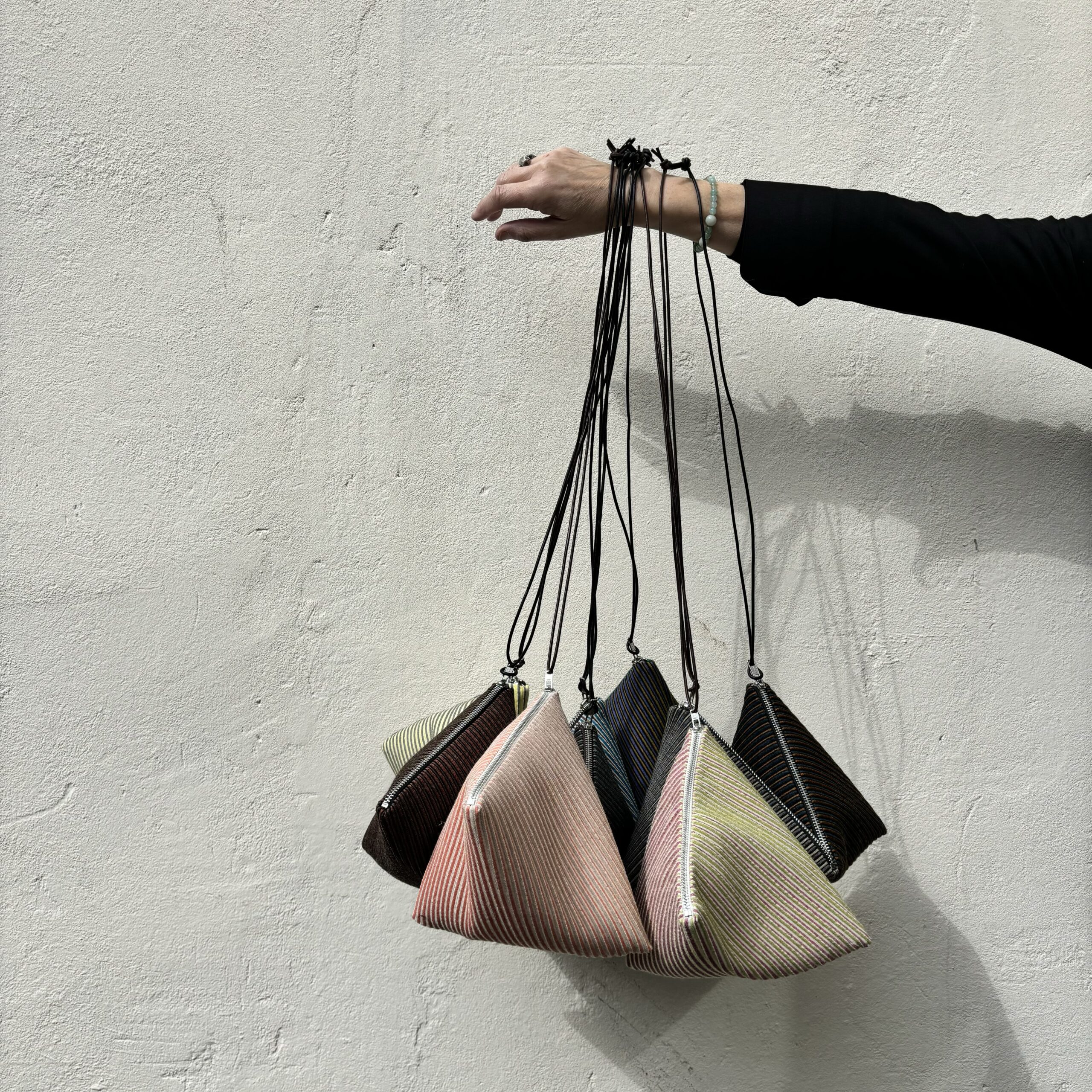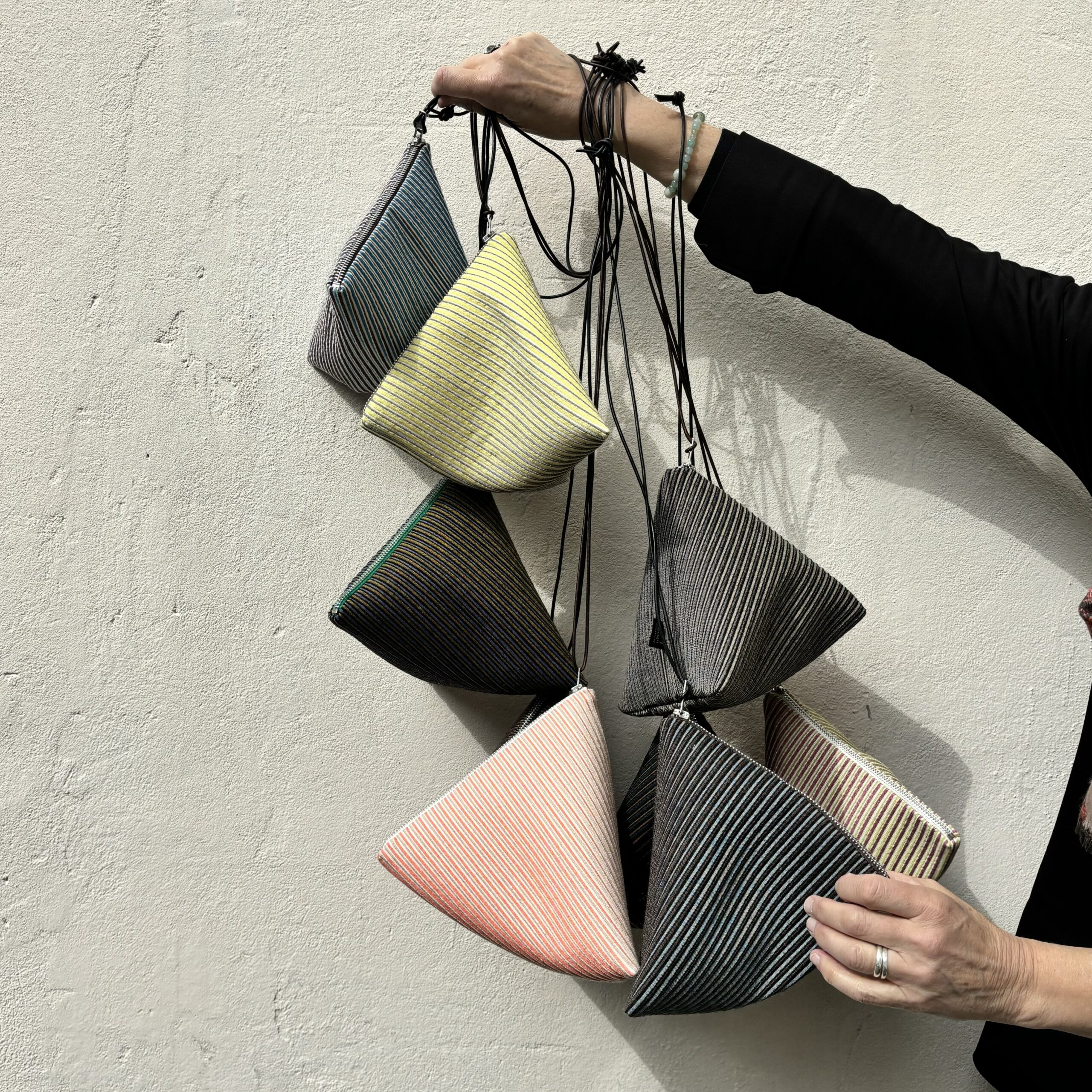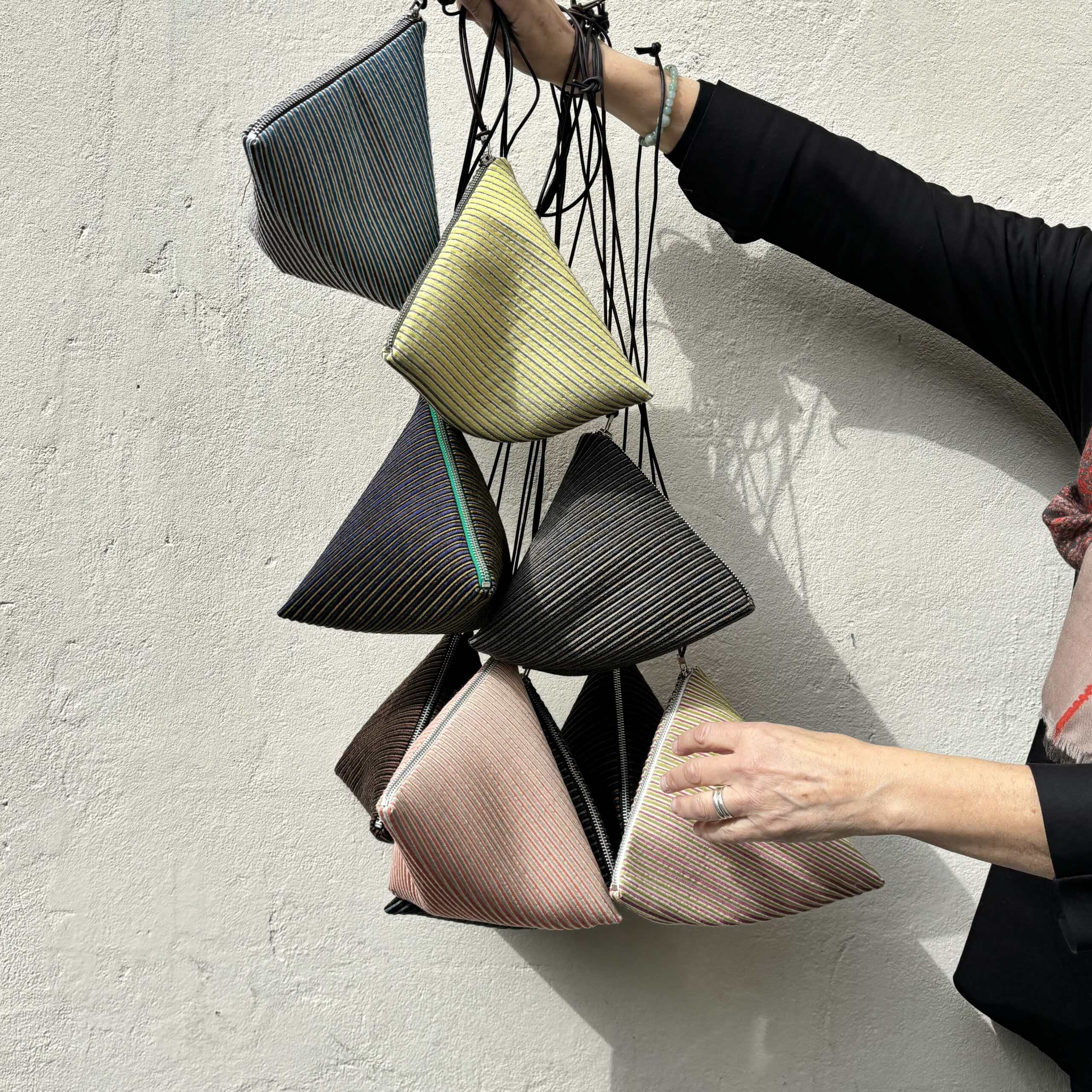 Nye Farver – Tetraede tasken er udført i chicago stof og har en side på 15 cm. Foer stof; Beawernylon og metal lynlås eller lynlås.