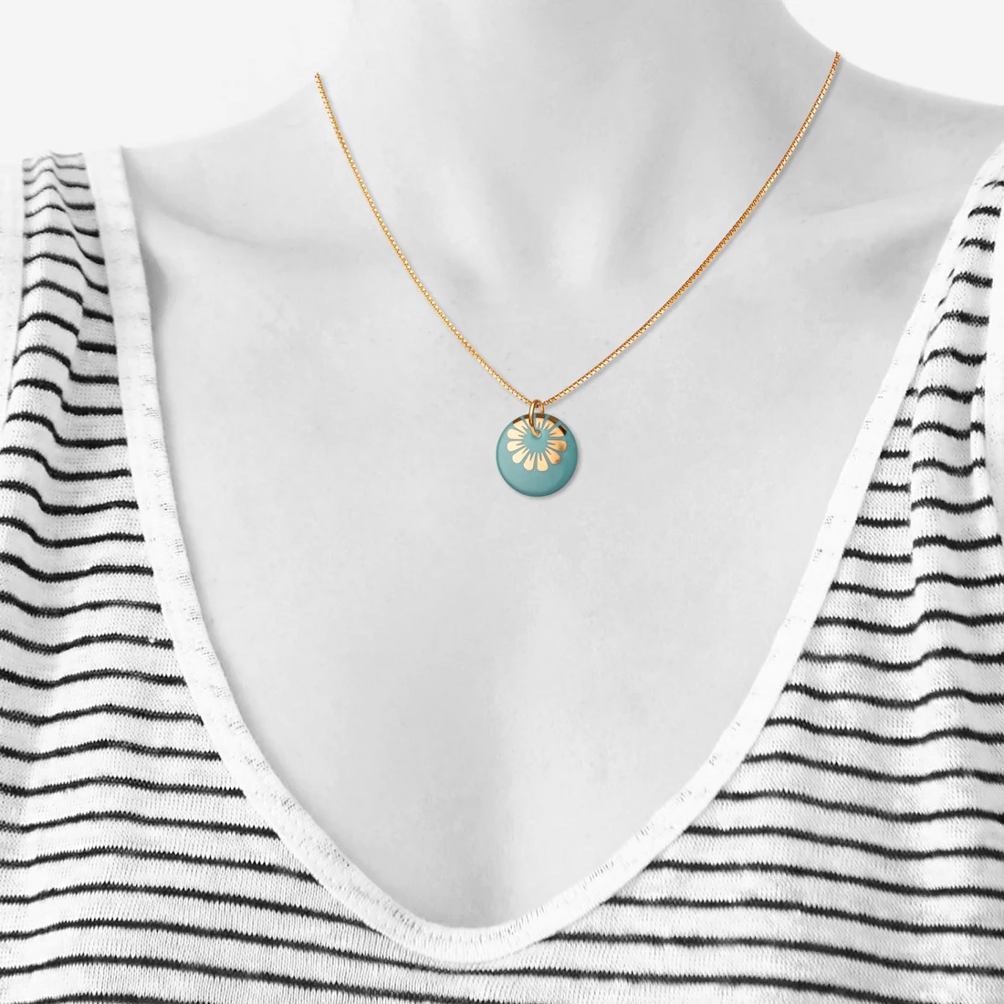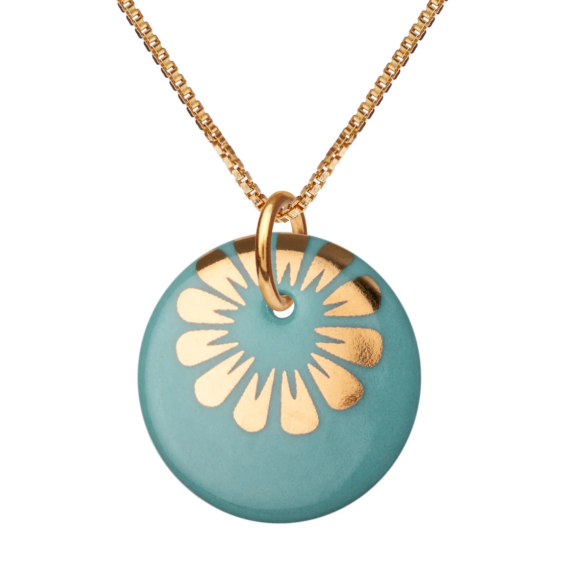 Veneziakæde med vedhæng af porcelæn, indfarvet i smuk aquamarin grøn, med SCHERNING’s klassiske BLOOM dekoration i blank guld.