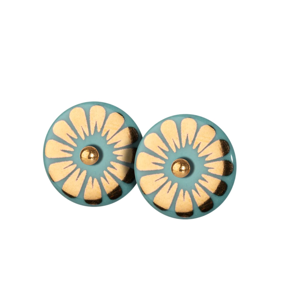 Ørestikkere af porcelæn, indfarvet i smuk aquamarin grøn, med SCHERNING’s klassiske BLOOM dekoration i blank guld.