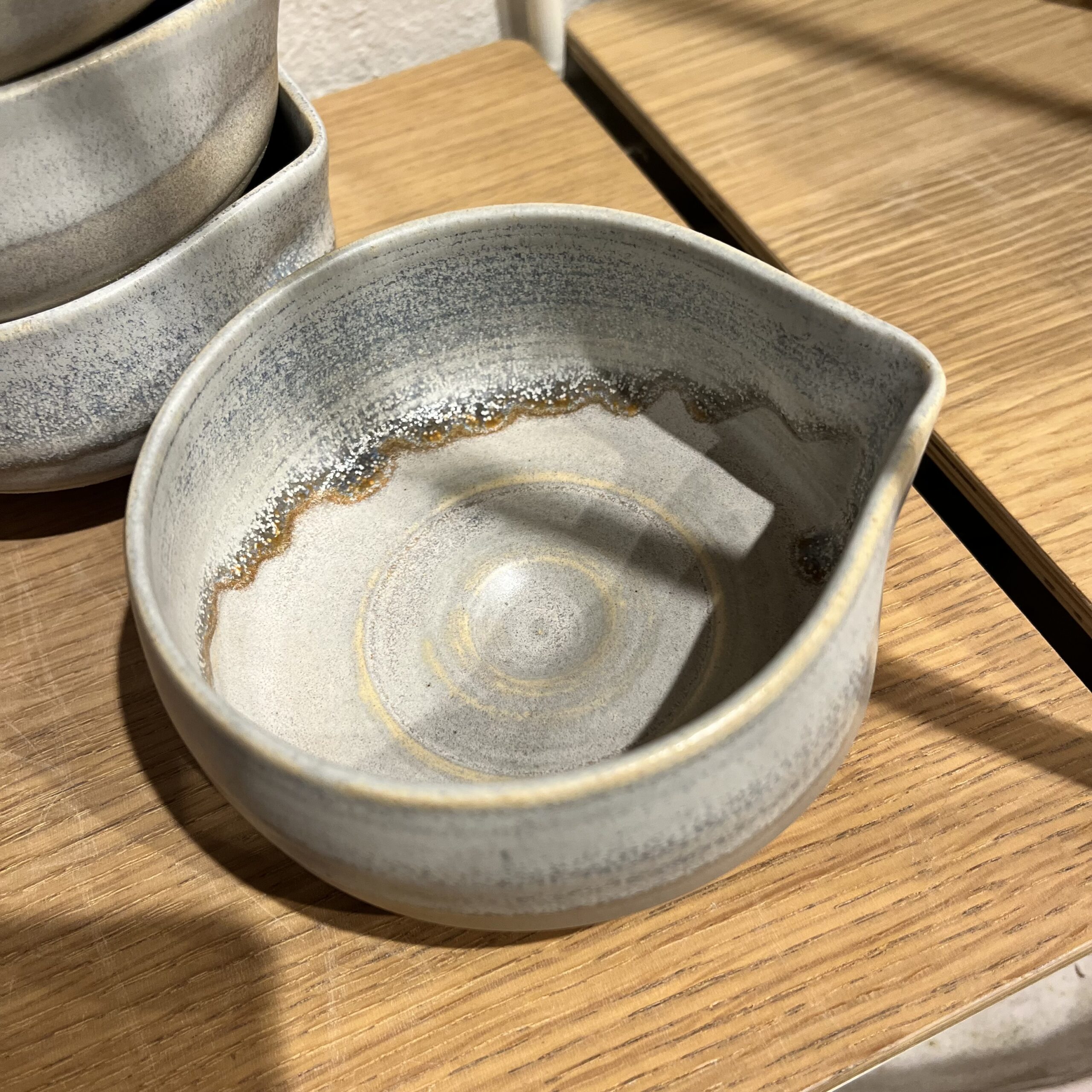 Smuk hånddrejet matcha skål med hældetud fra den danske keramiker Signe Schmidt. Skålen er skabt så den er ideel at piske din matcha te i, men du kan også bruge skålen til andre varme drikke – eller bare som skål.