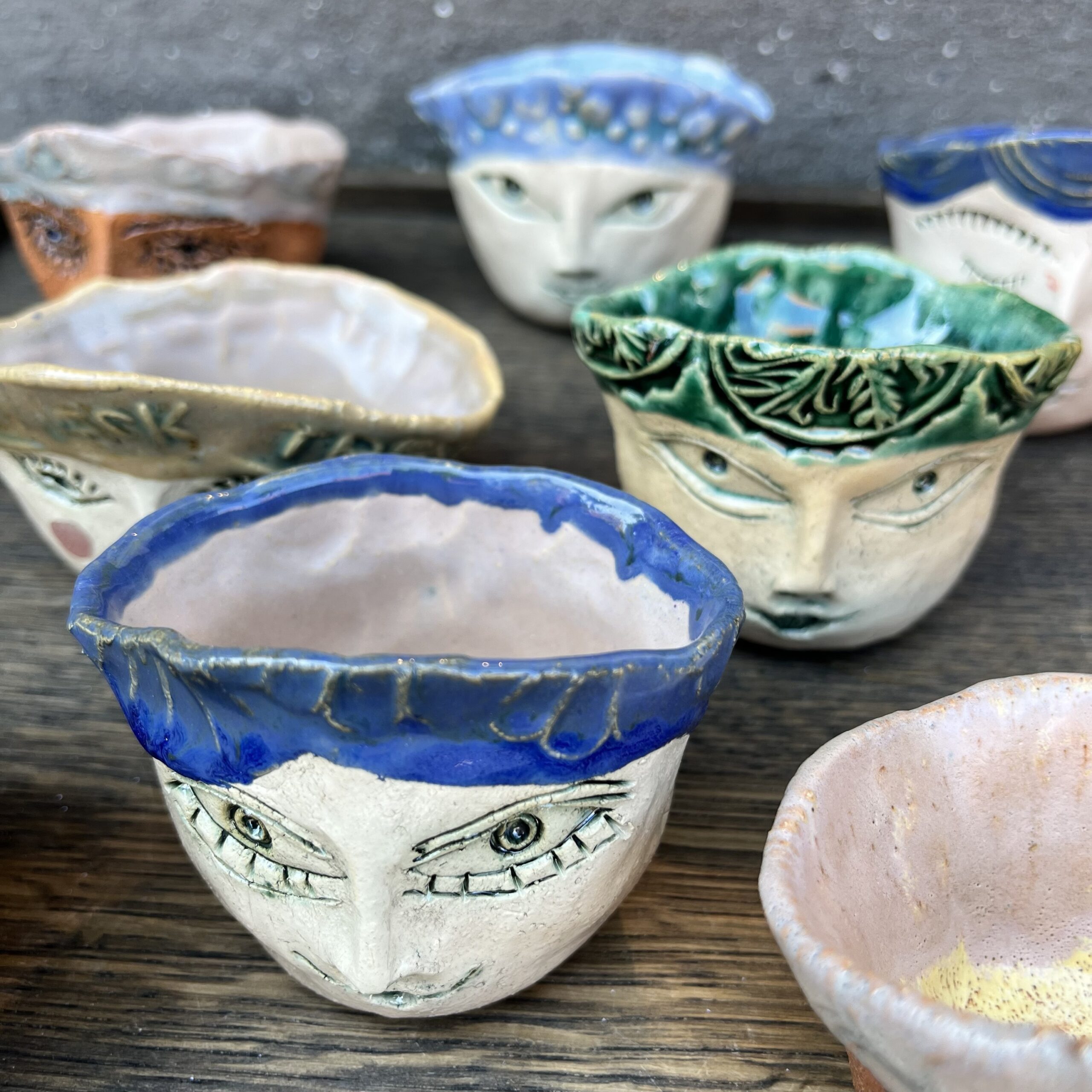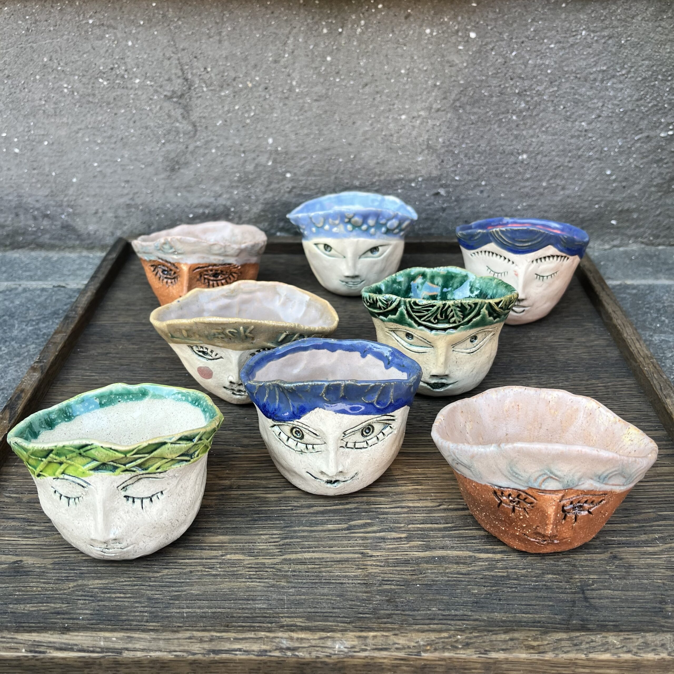Nye små skåle med personlige og dyr ansigter, der udtrykkes gennem teksturer, farver og enkle mønstre og linjer skabt af Mette Joensen. De er fine til smykker eller måske med plante eller til karse. Hver styk er fuldstændig unik og helt sin egen.