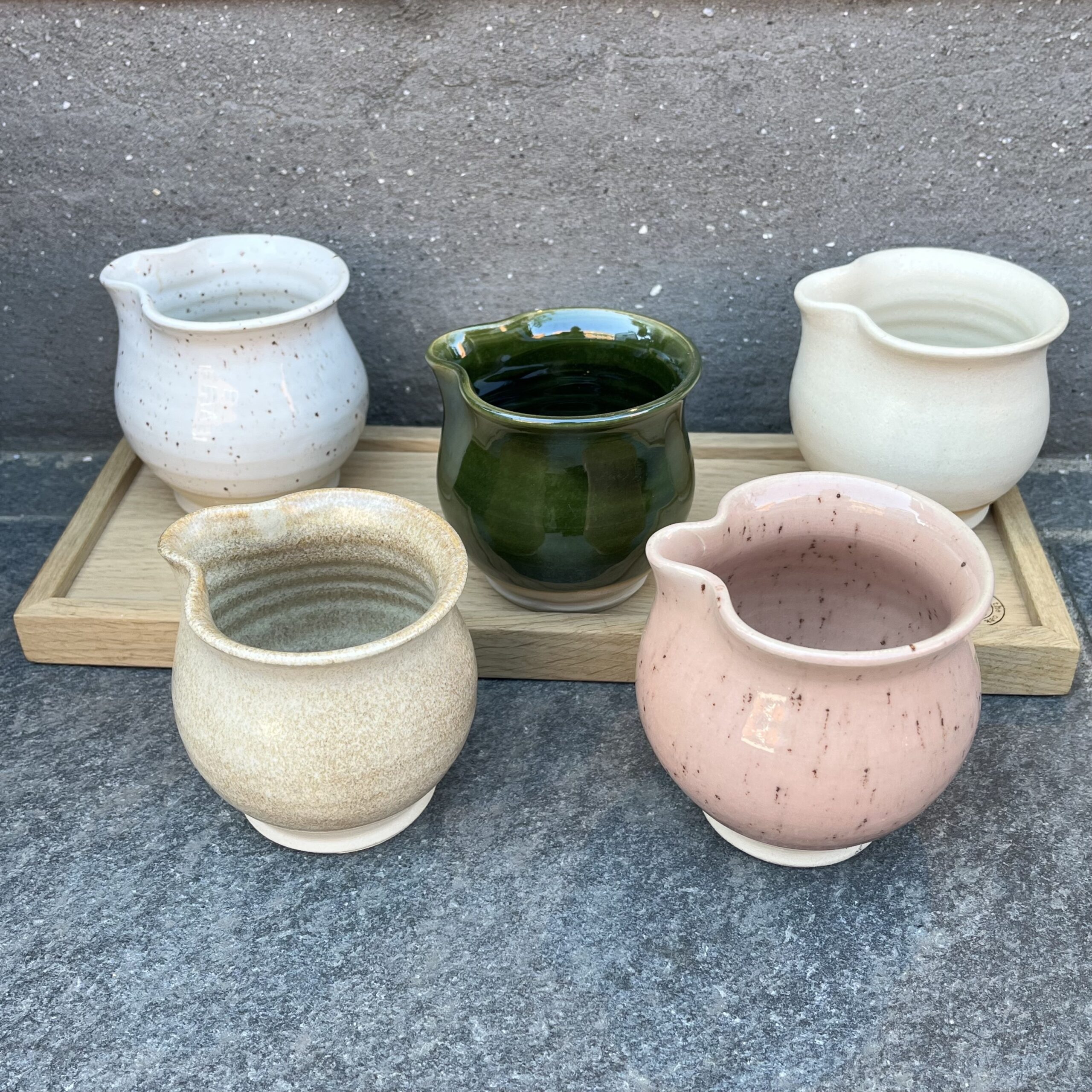 Håndlavet flødekande i keramik i fem flotter farver.