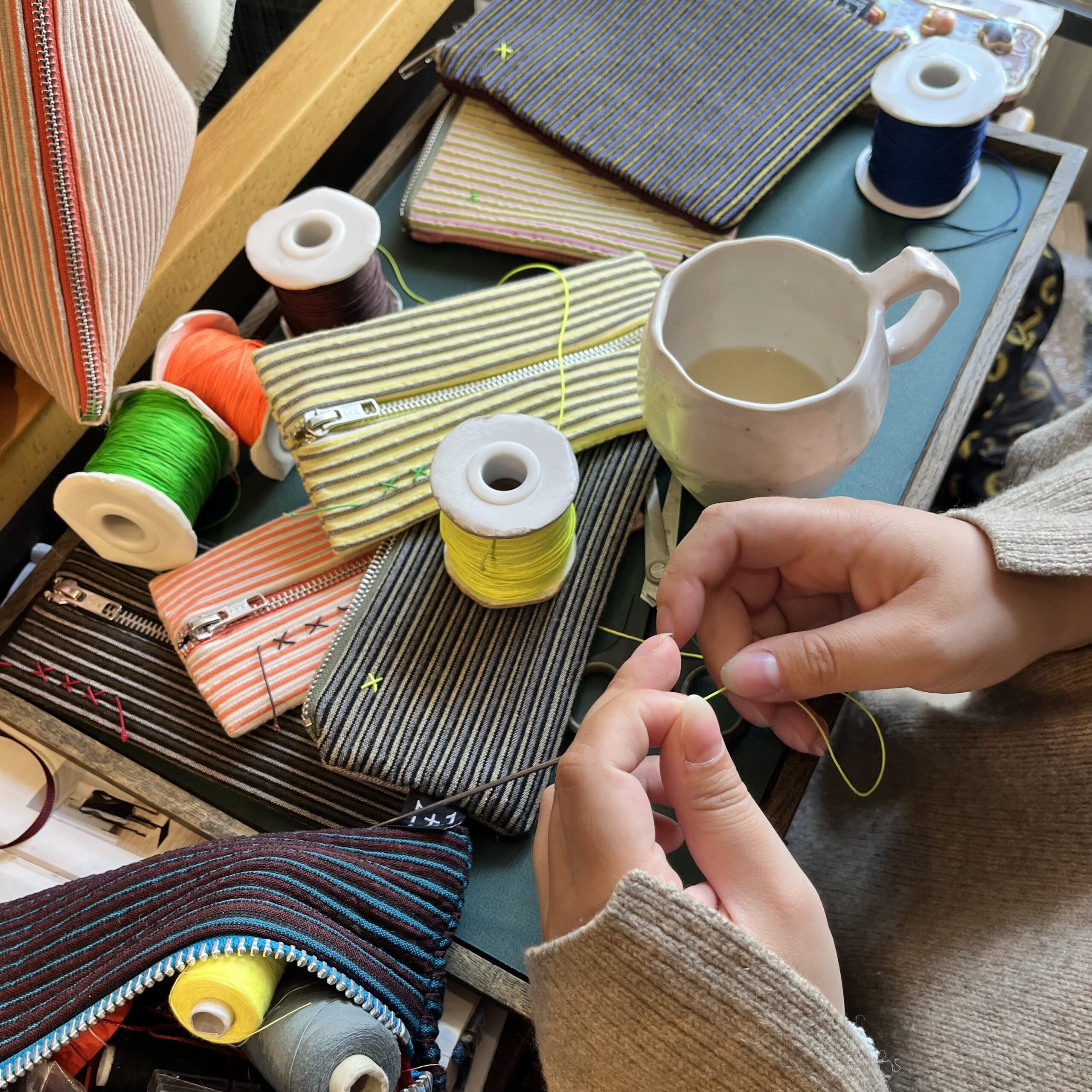 Tasker og tekstile hverdagsobjekter er udviklet med fokus på anvendelighed og materialekvalitet. Gennem bevidste valg af farver, strukturer og form opstår designs, der både er robuste, funktionelle og visuelt afbalancerede.