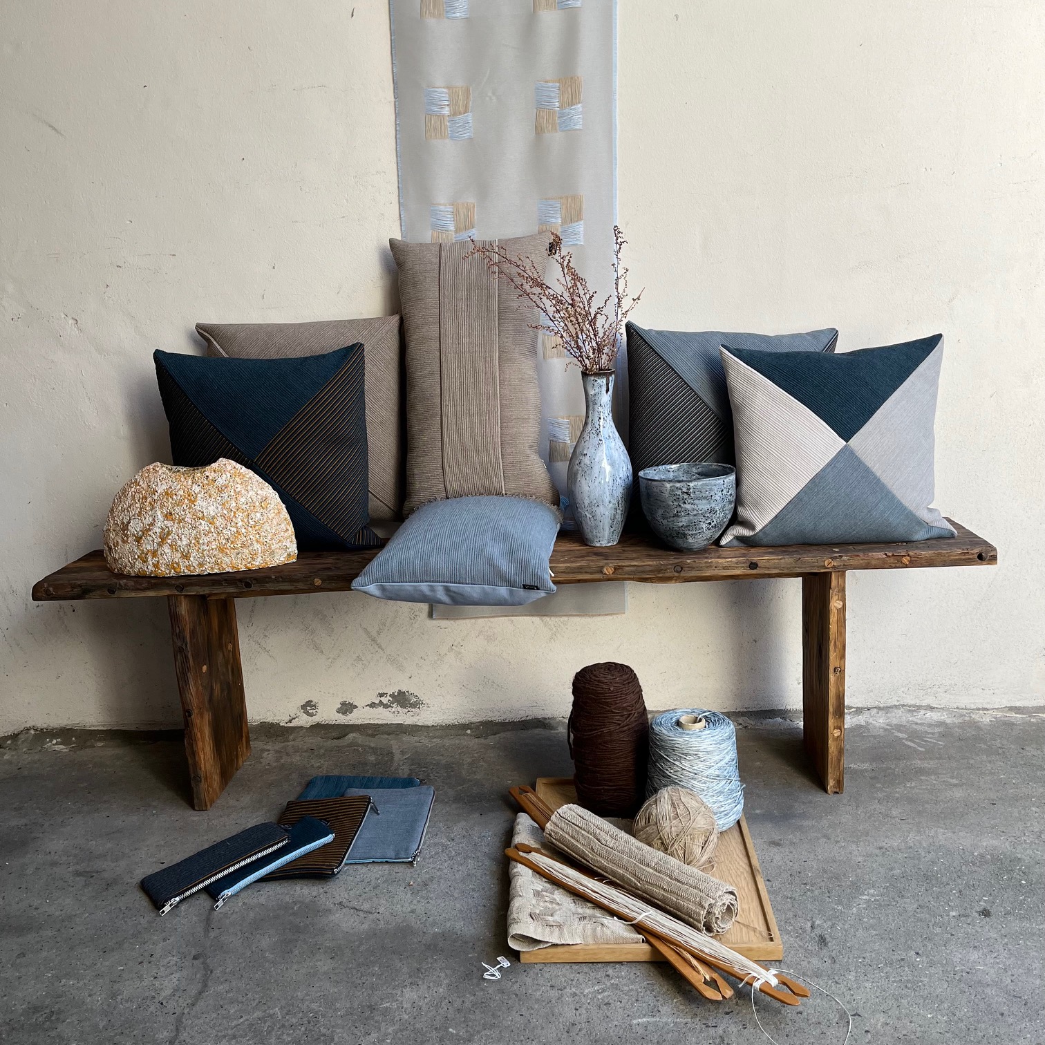 Hvert design bærer et tydeligt håndværksmæssigt aftryk og er skabt til at indgå naturligt i hverdagen – som både funktionelle og sanselige tekstile objekter.